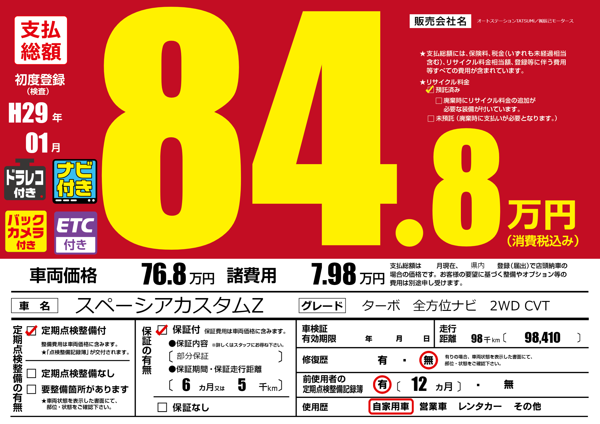 | 走行キロ | 9.8万km | 初年度登録 | H29年01月 |