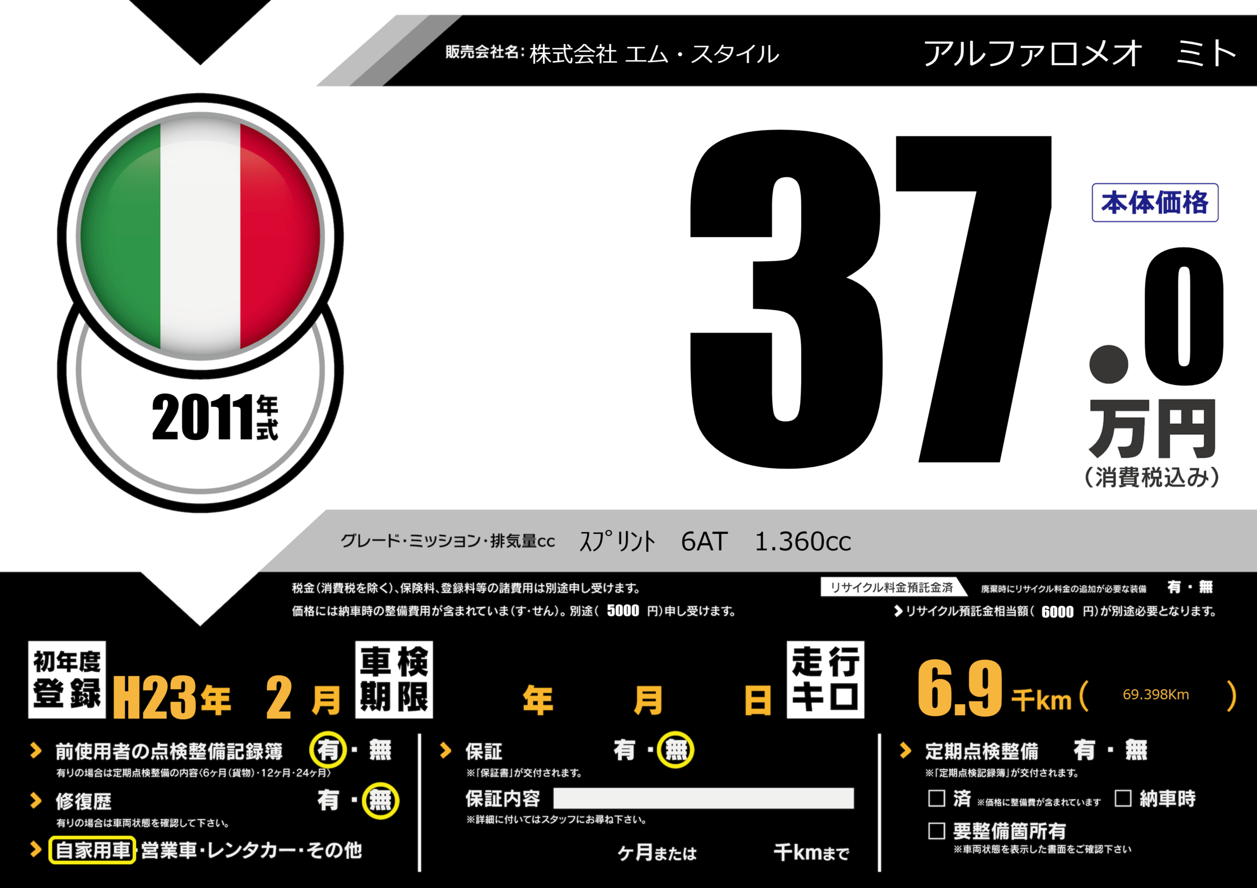 | 車名 | アルファロメオ ミト | グレード ミッション 排気量 |