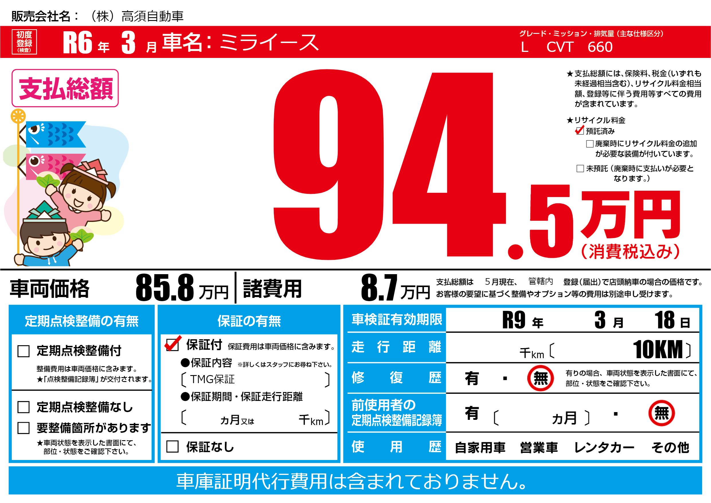 保証付き 保証内容(TMG保証) ---ヶ月または()千kmまで |