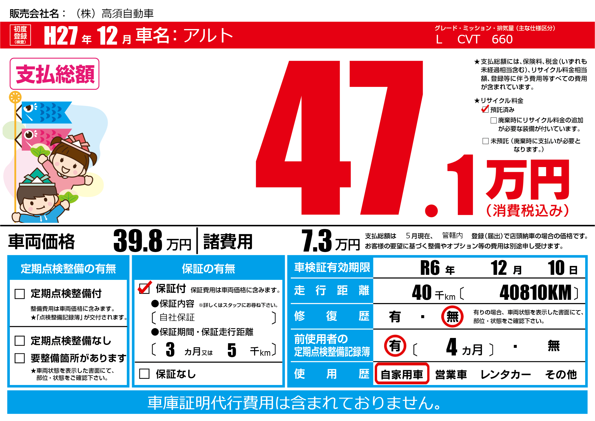 | 走行キロ | 4万km | 初年度登録 | H27年12月 |