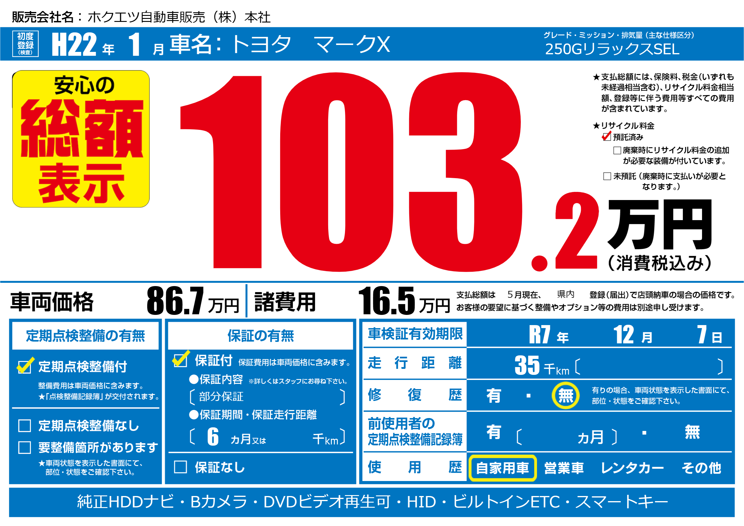 | 走行キロ | 3.5万km | 初年度登録 | H22年1月 |