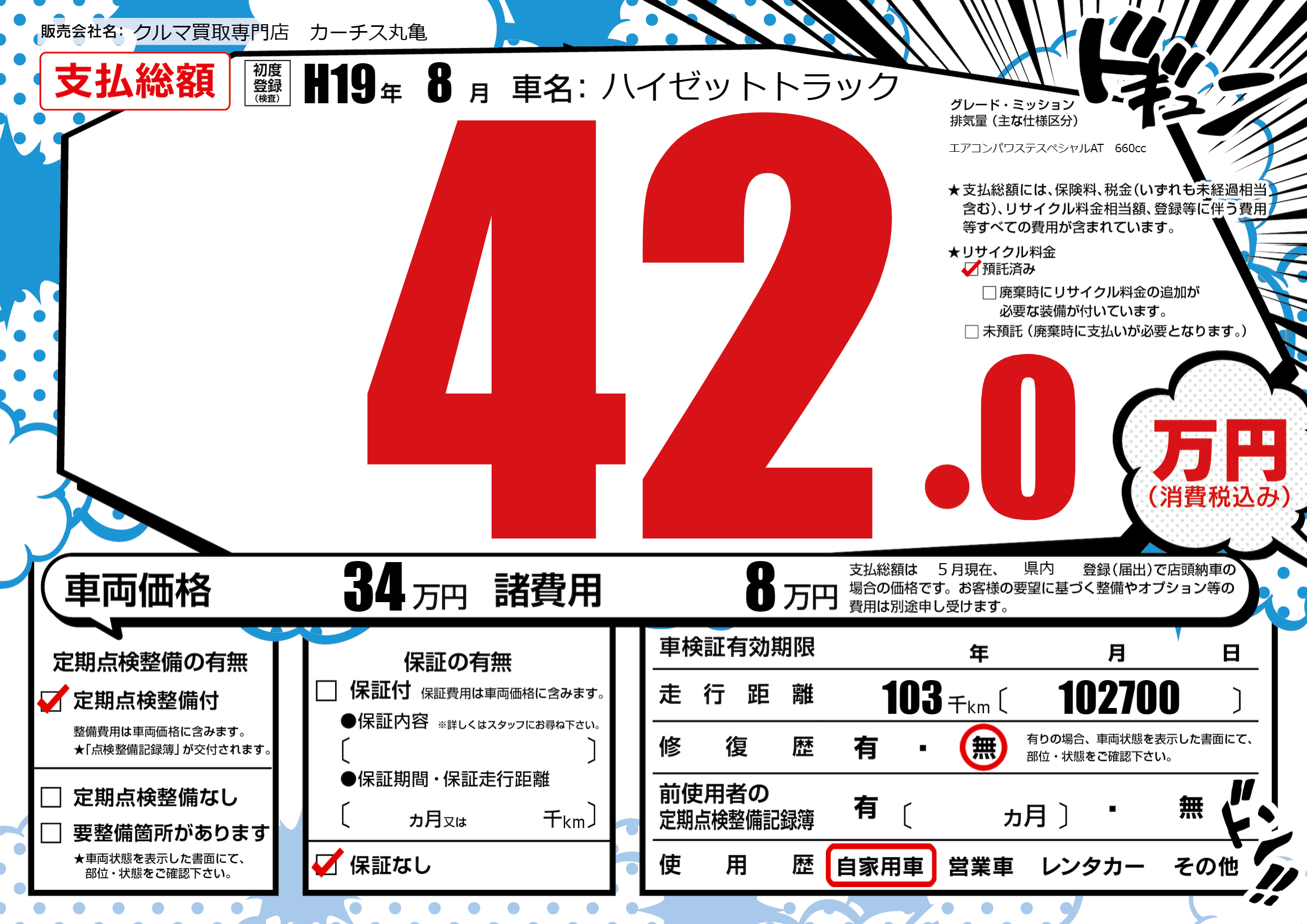 | 車名 | ハイゼットトラック | グレード ミッション 排気量 |