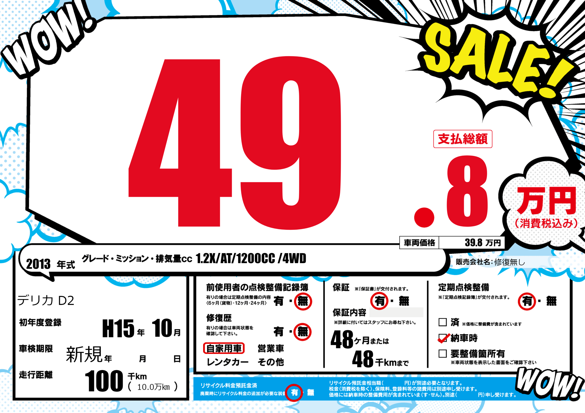 保証付き 保証内容(---) 48ヶ月または(48)千kmまで |