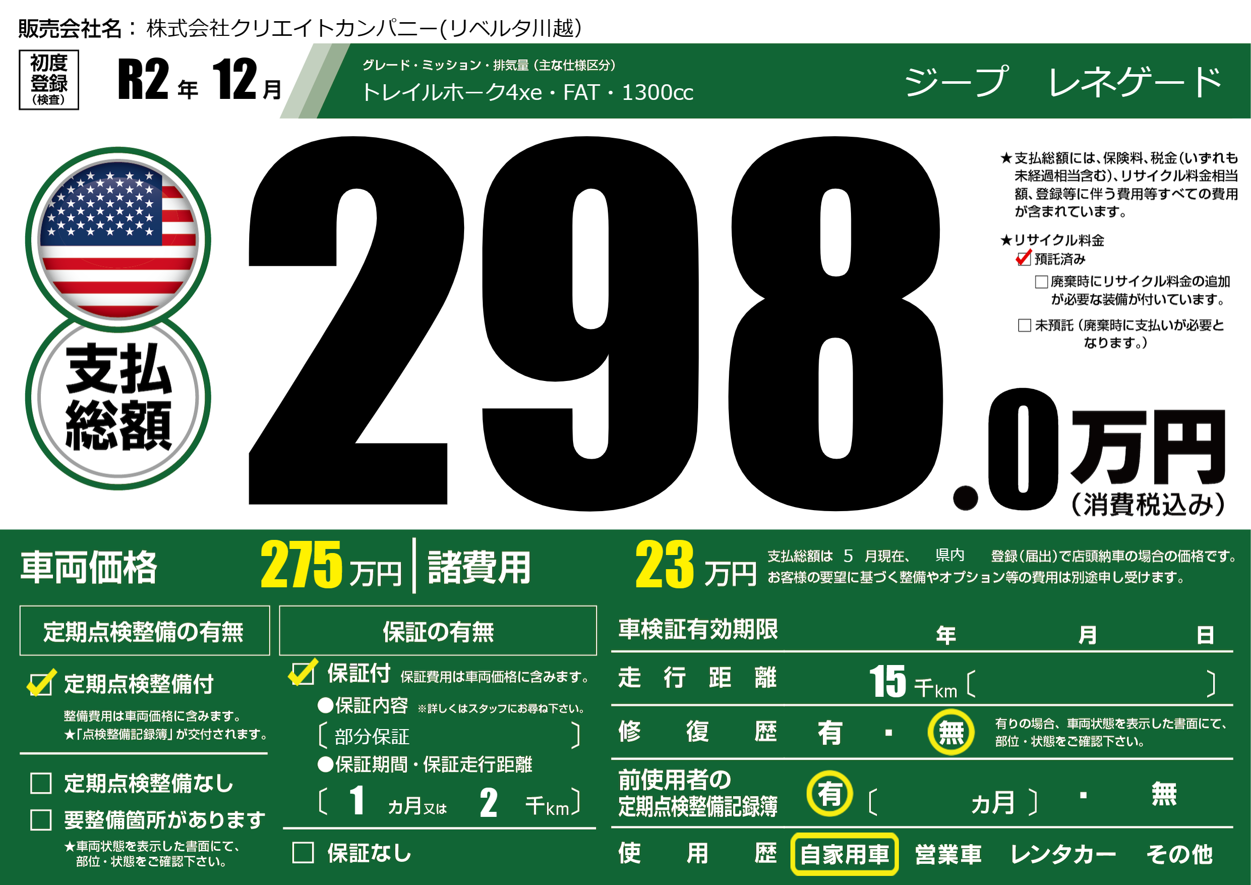 | 車名 | ジープ レネゲード | グレード ミッション 排気量 |