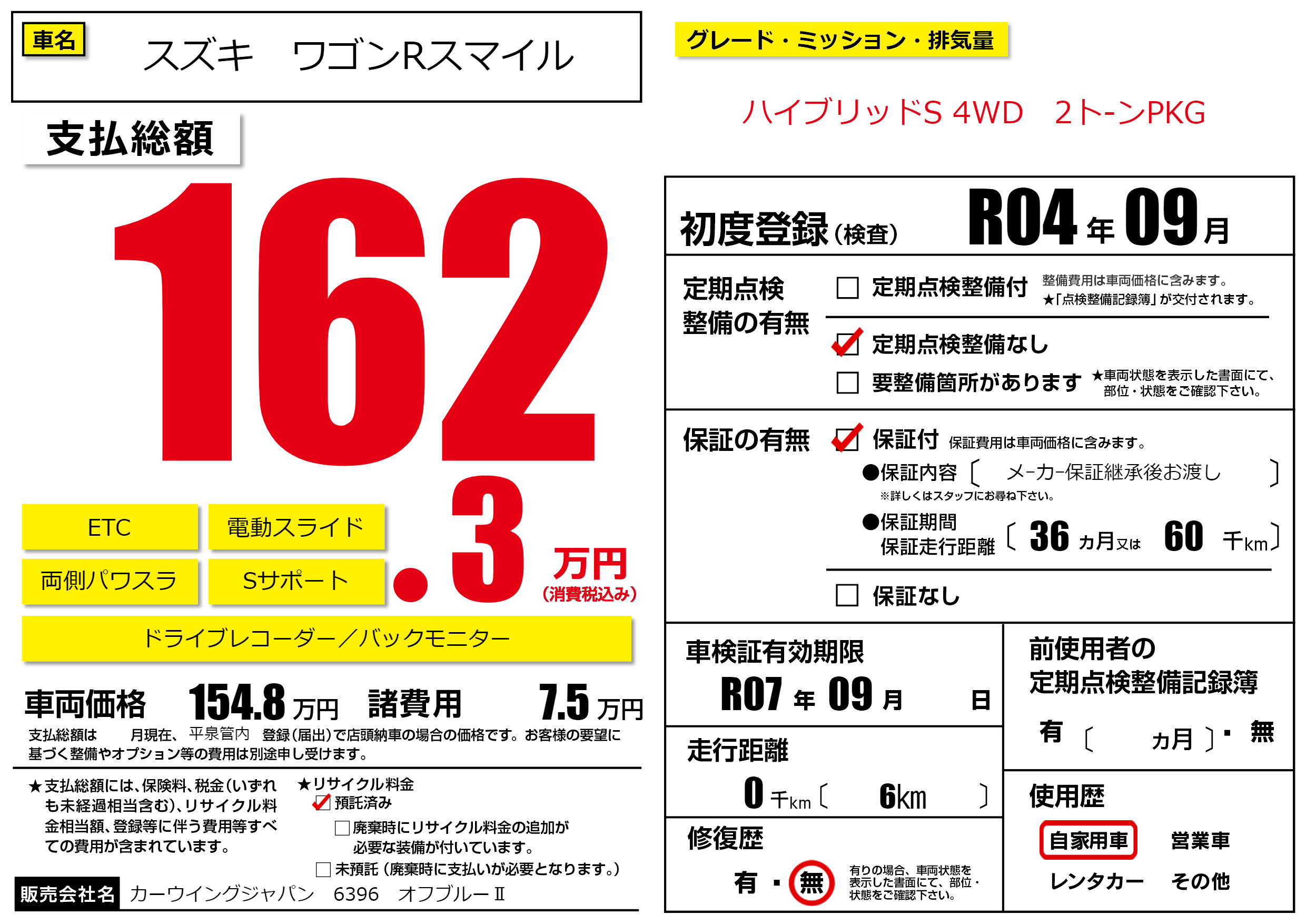 | 車名 | スズキ ワゴンRスマイル | グレード ミッション 排気量 |