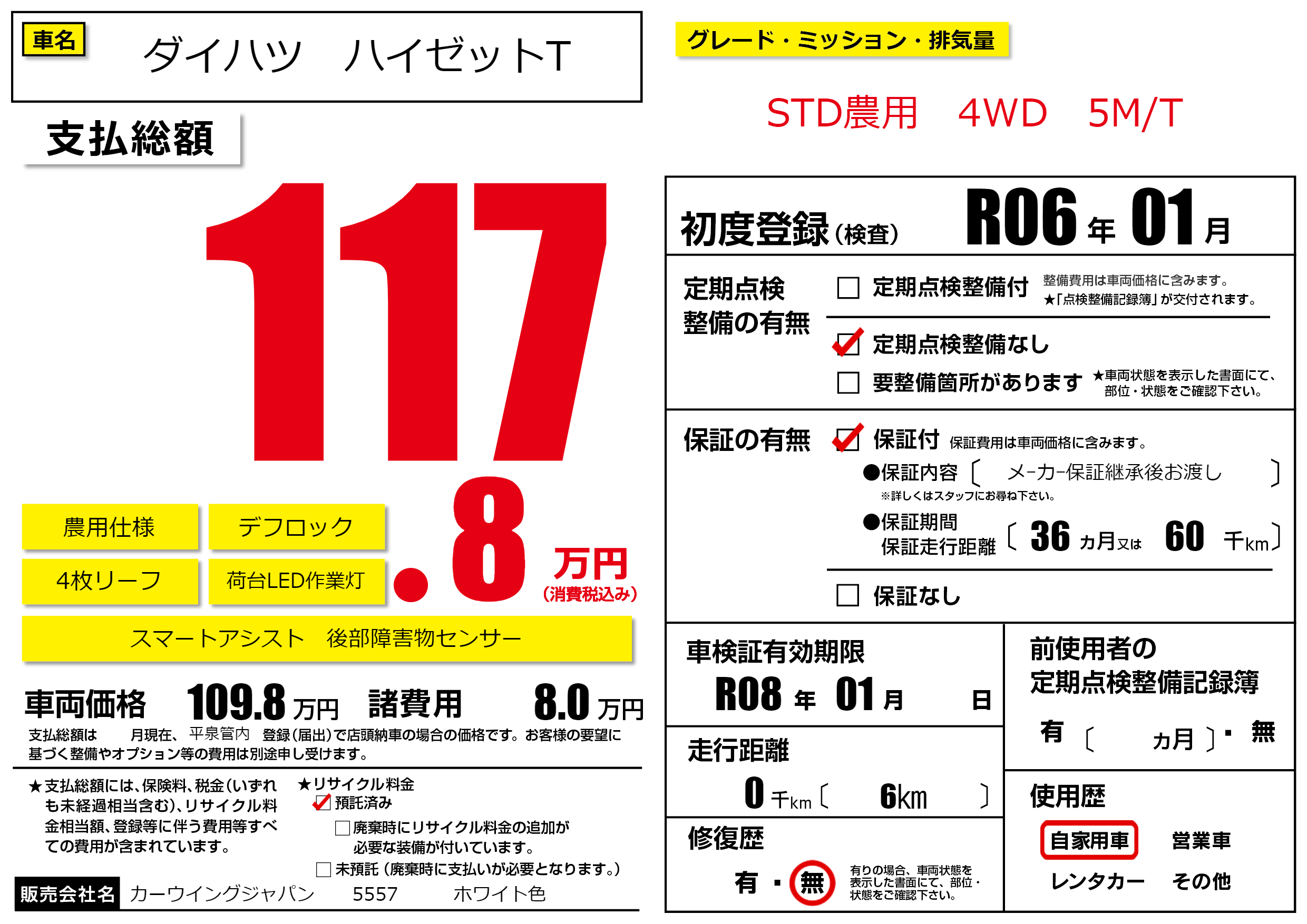 | 車名 | ダイハツ ハイゼットT | グレード ミッション 排気量 |