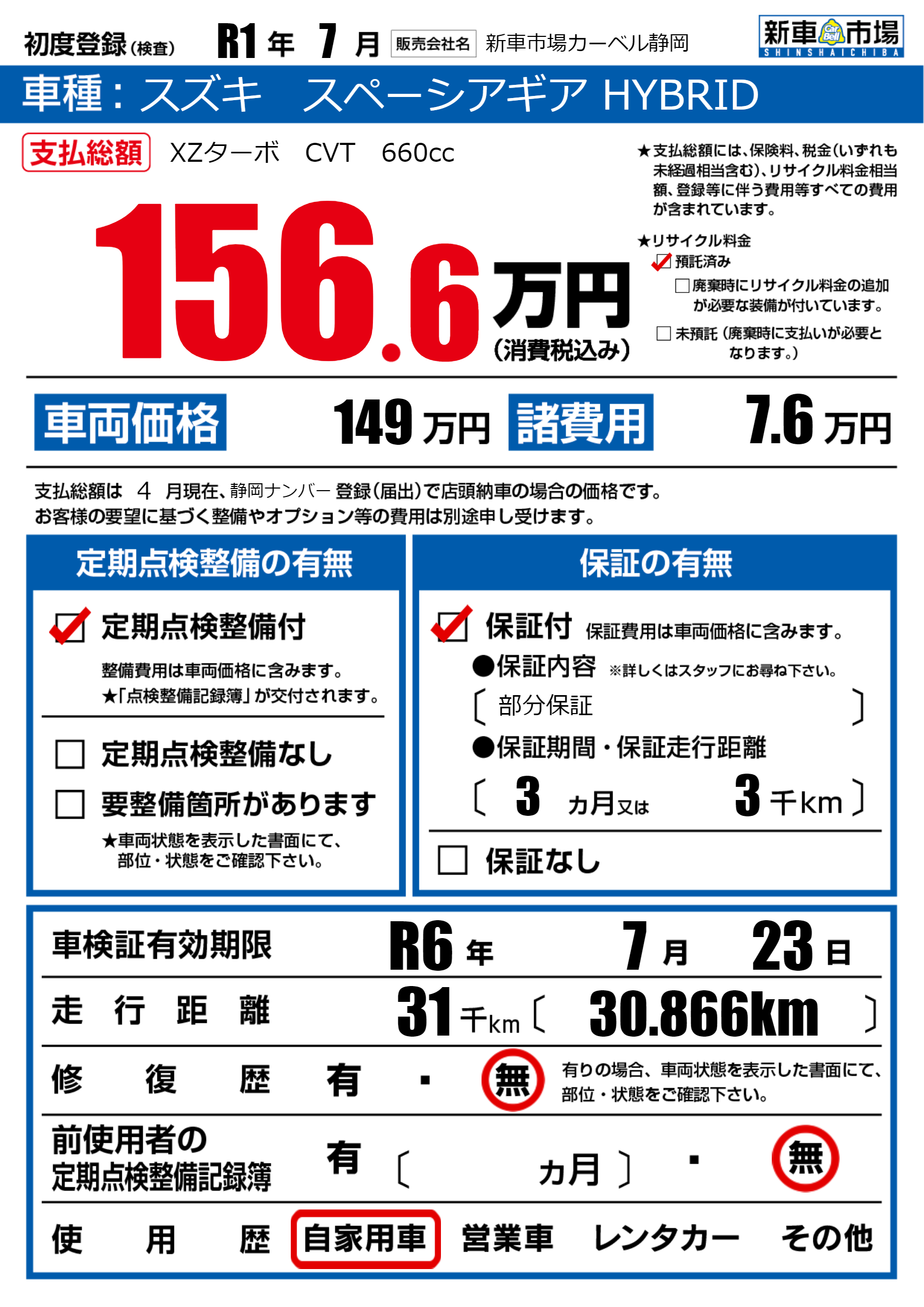 | 車検制限 | R6年 7月 23日 | ||