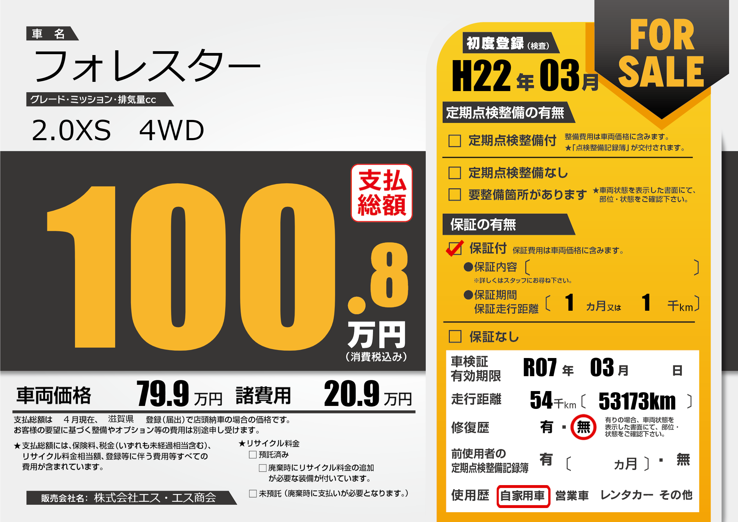 | 車名 | フォレスター | グレード ミッション 排気量 |