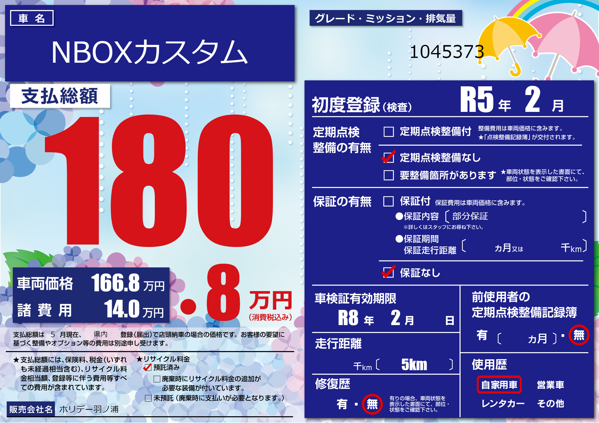 | 走行キロ | - | 初年度登録 | R5年2月 |