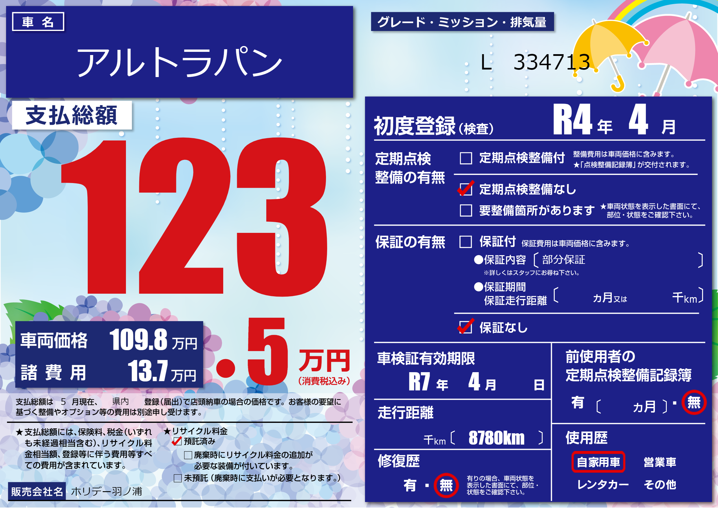 なし | 車検制限 | R7年4月---月 |