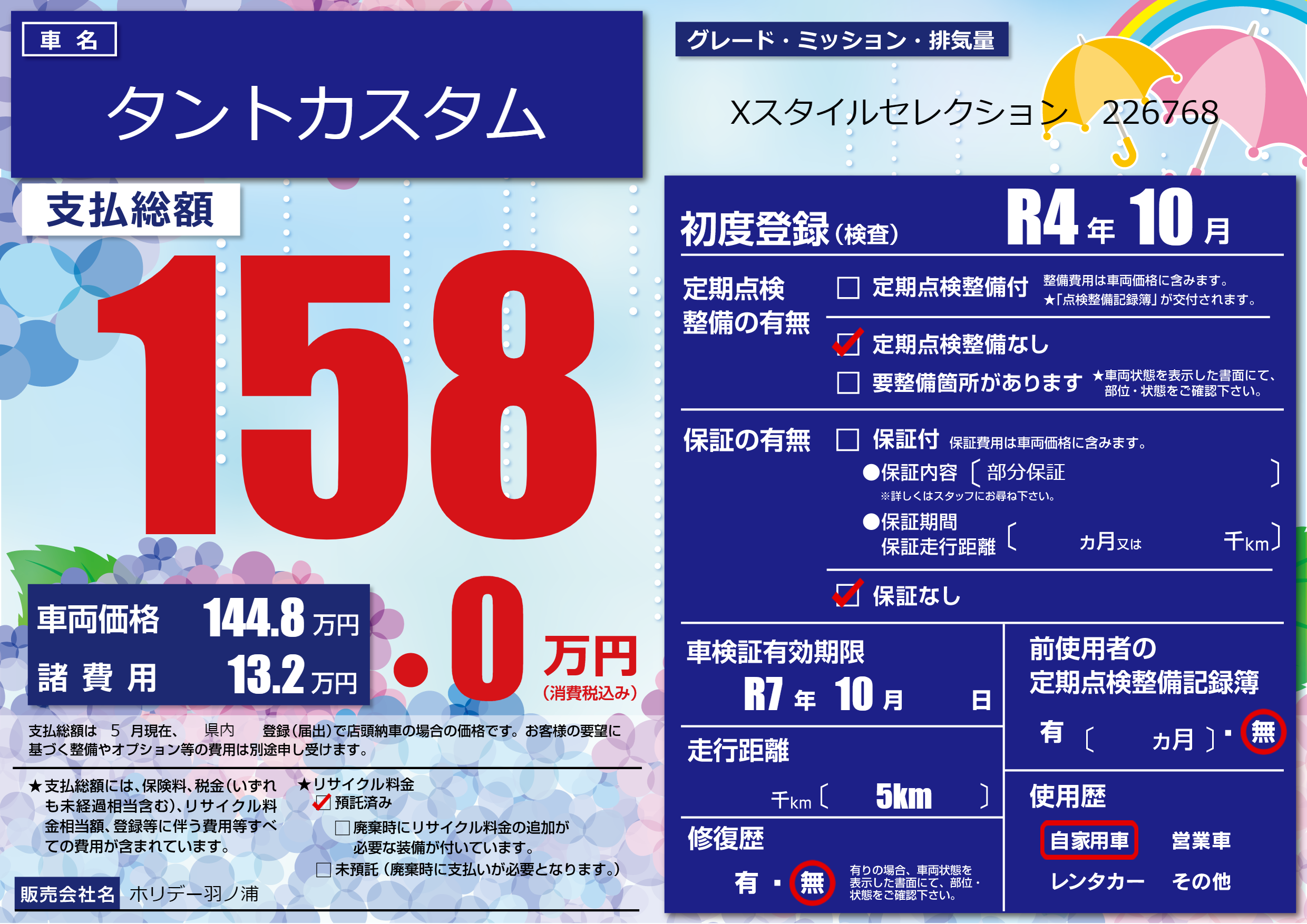 | 車名 | タントカスタム | グレード ミッション 排気量 |