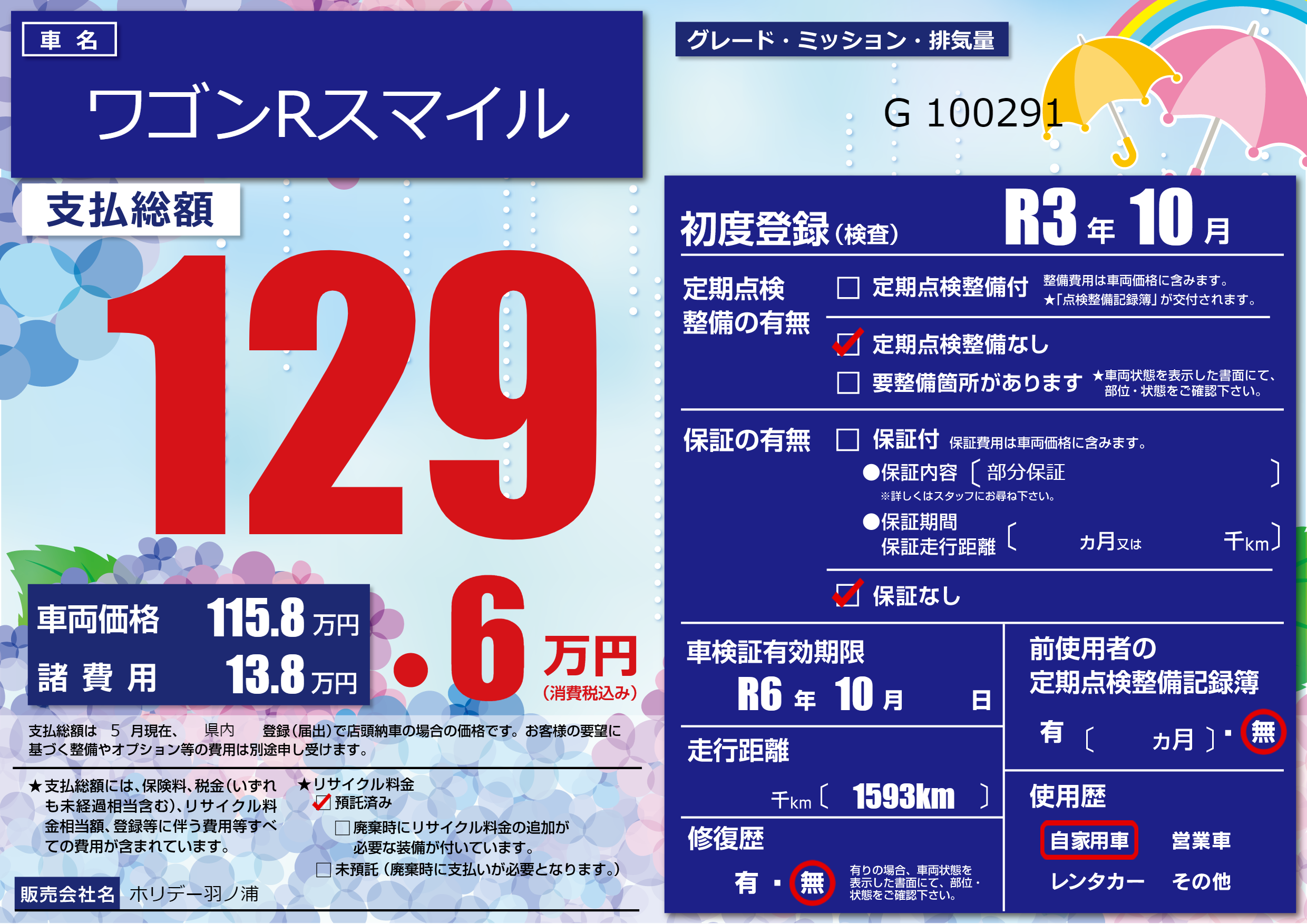 | 車名 | ワゴンRスマイル | グレード ミッション 排気量 |