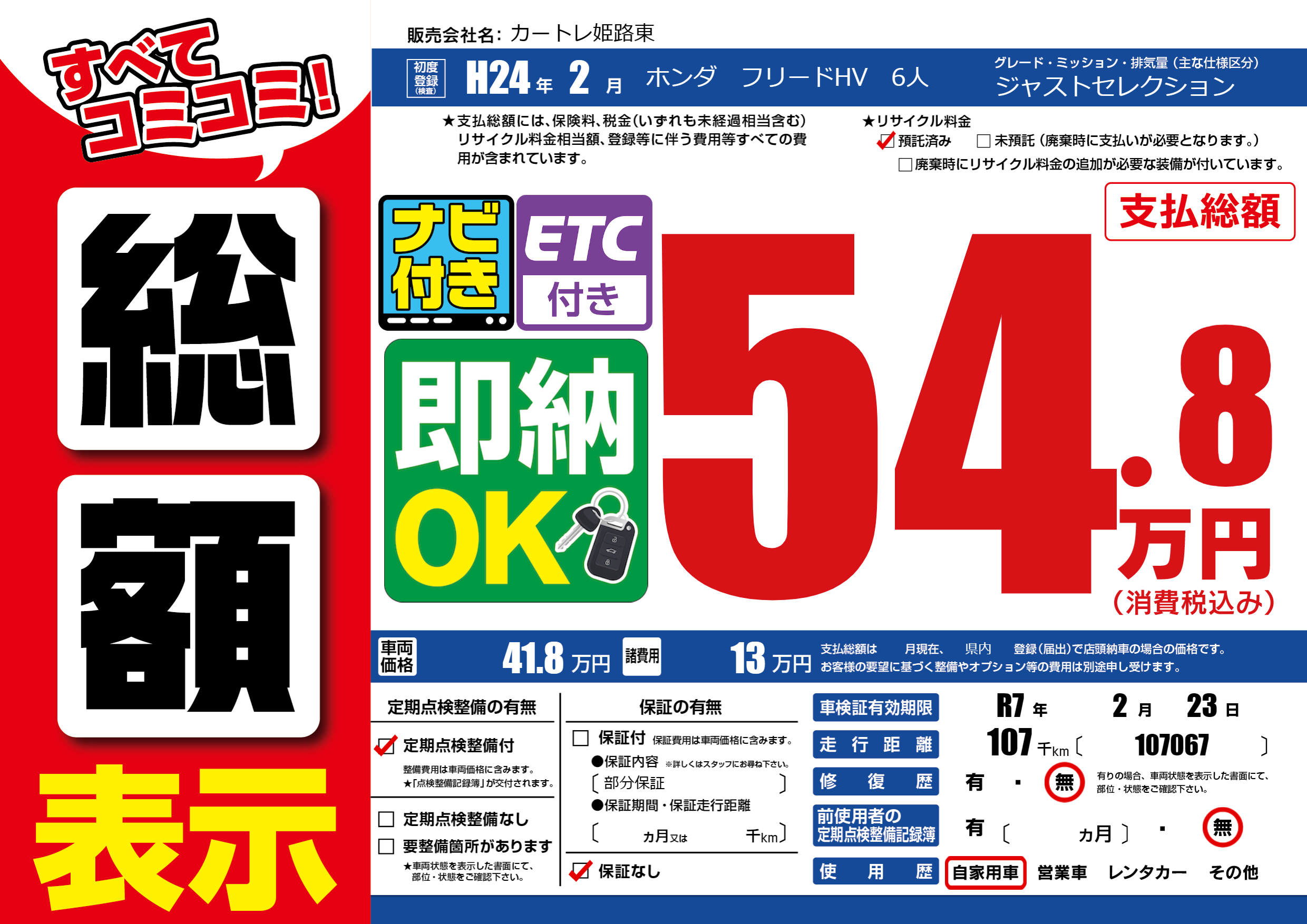 | 走行キロ | 10.7万km | 初年度登録 | H24年2月 |
