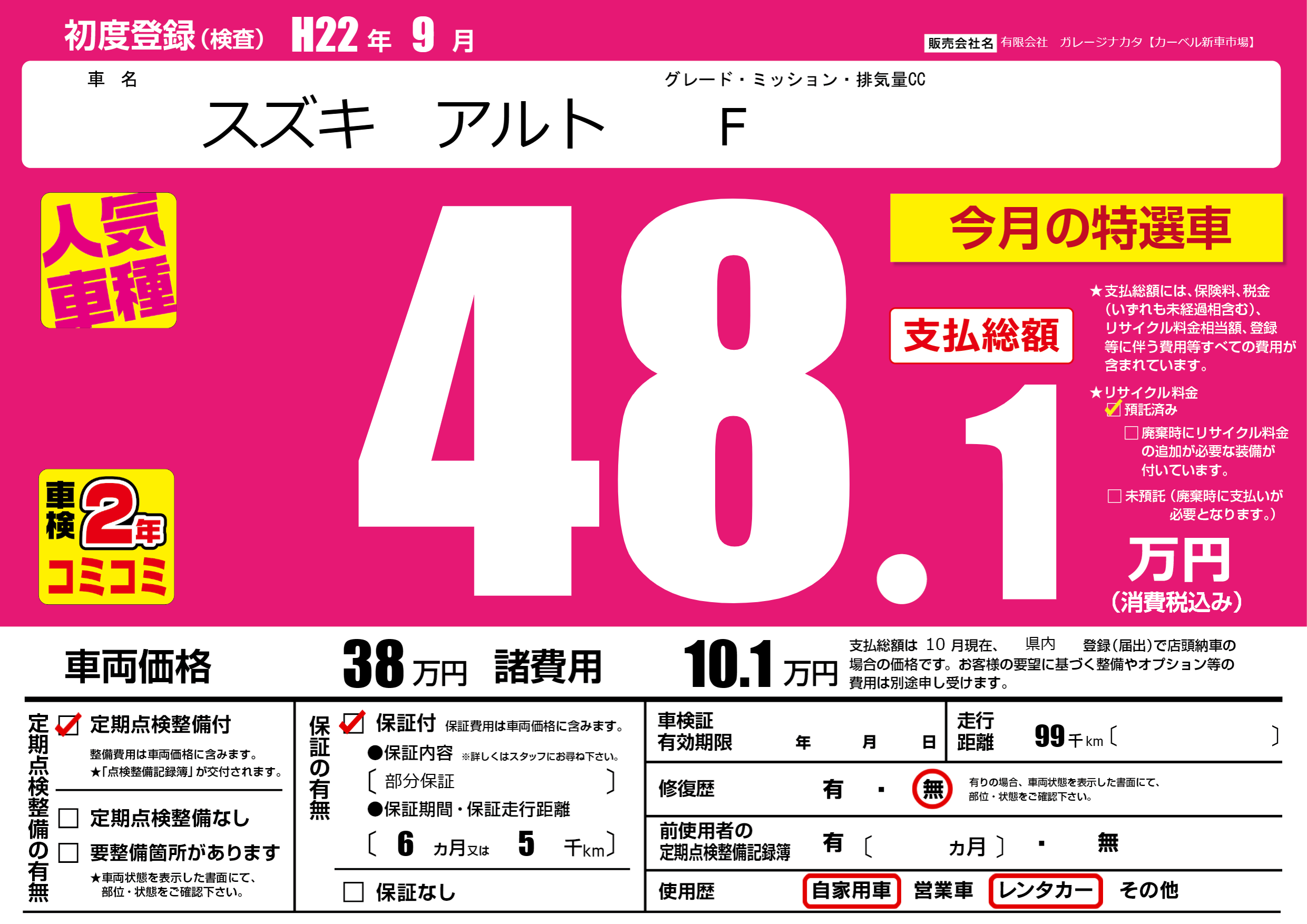 | 車名 | スズキ アルト | グレード ミッション 排気量 |