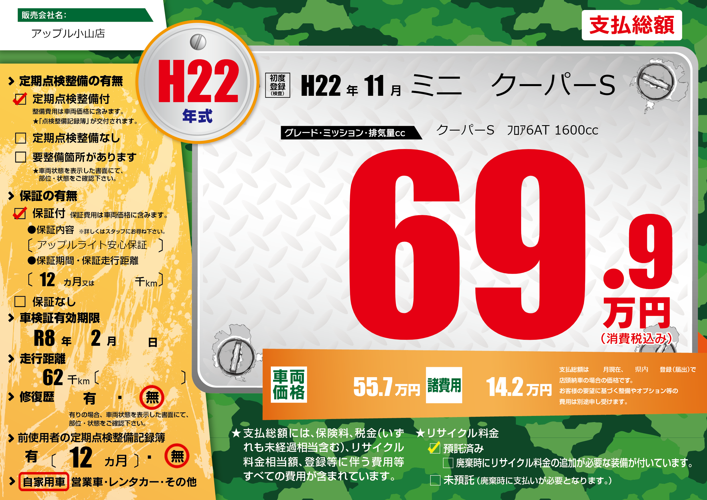 | 走行キロ | 6.2万km | 初年度登録 | H22年11月 |