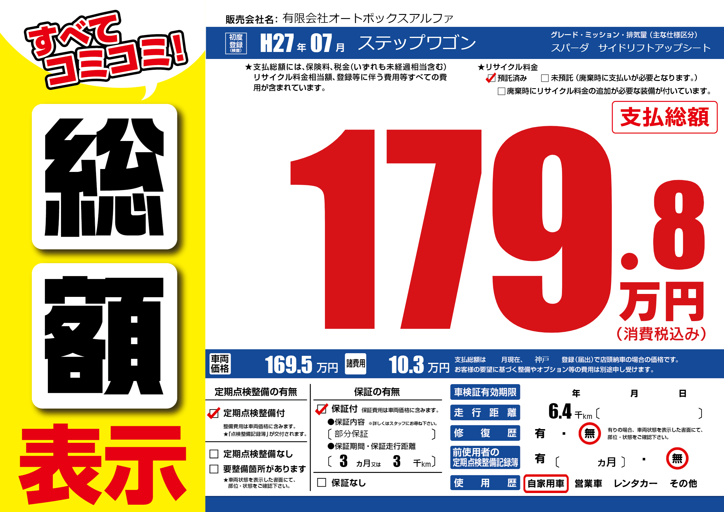 | 走行キロ | 0.6万km | 初年度登録 | H27年07月 |