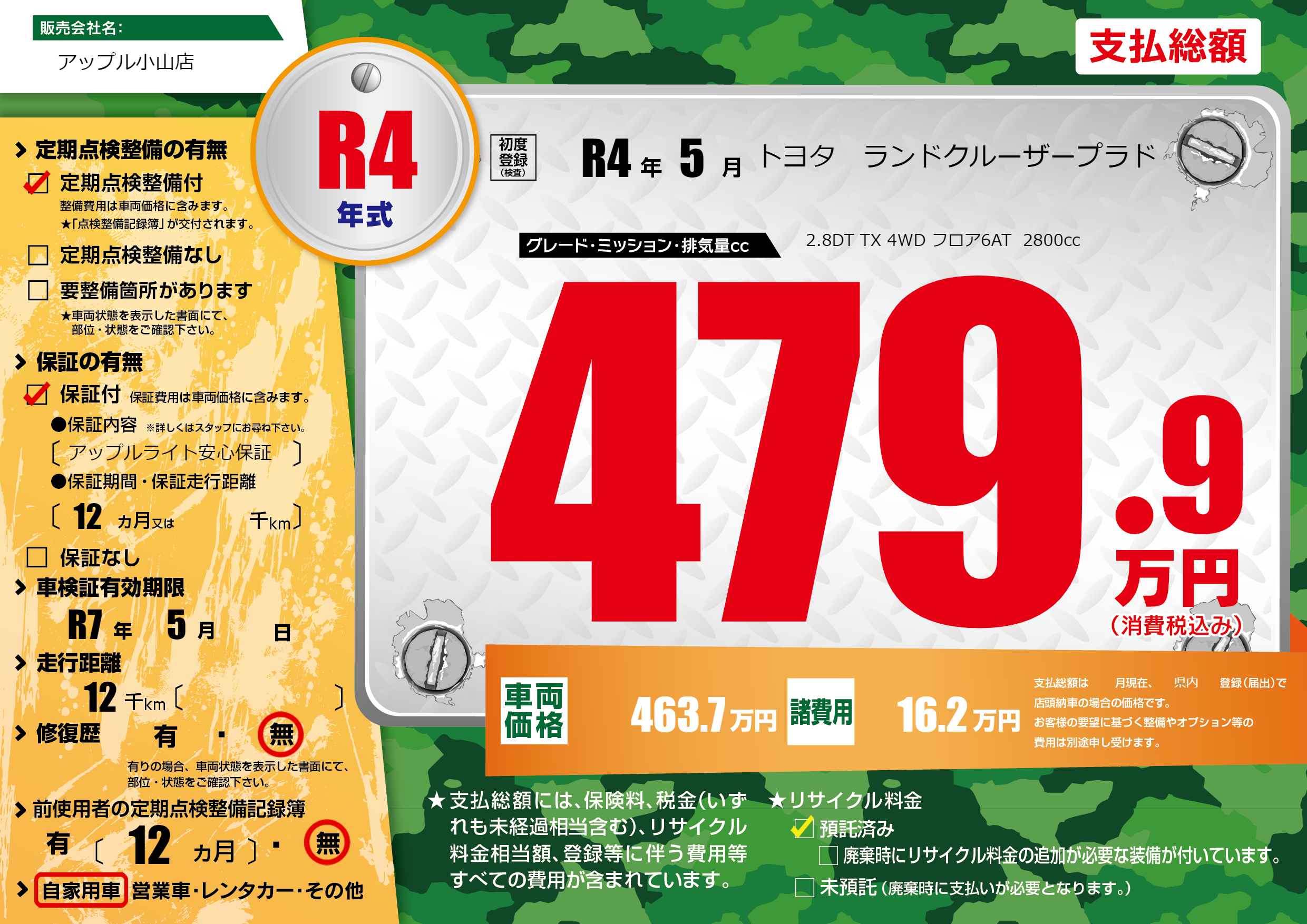 | 車名 | トヨタ ランドクルーザープラド | グレード ミッション 排気量 |