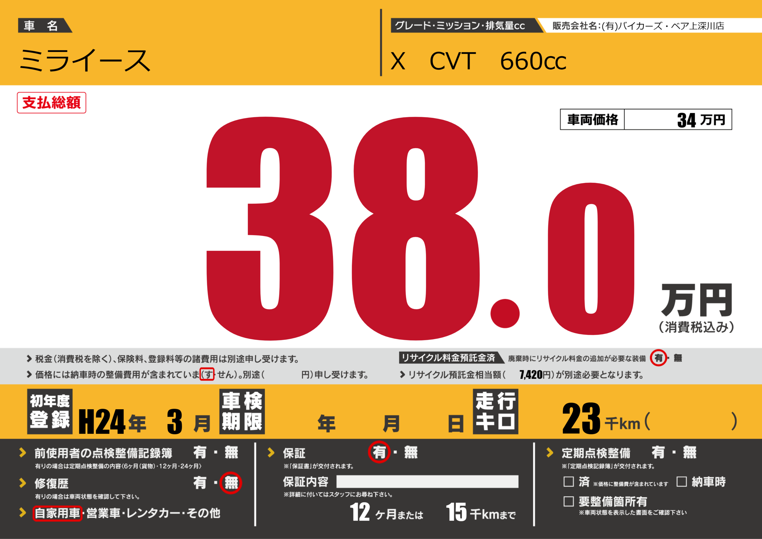 | 車名 | ミライース | グレード ミッション 排気量 |