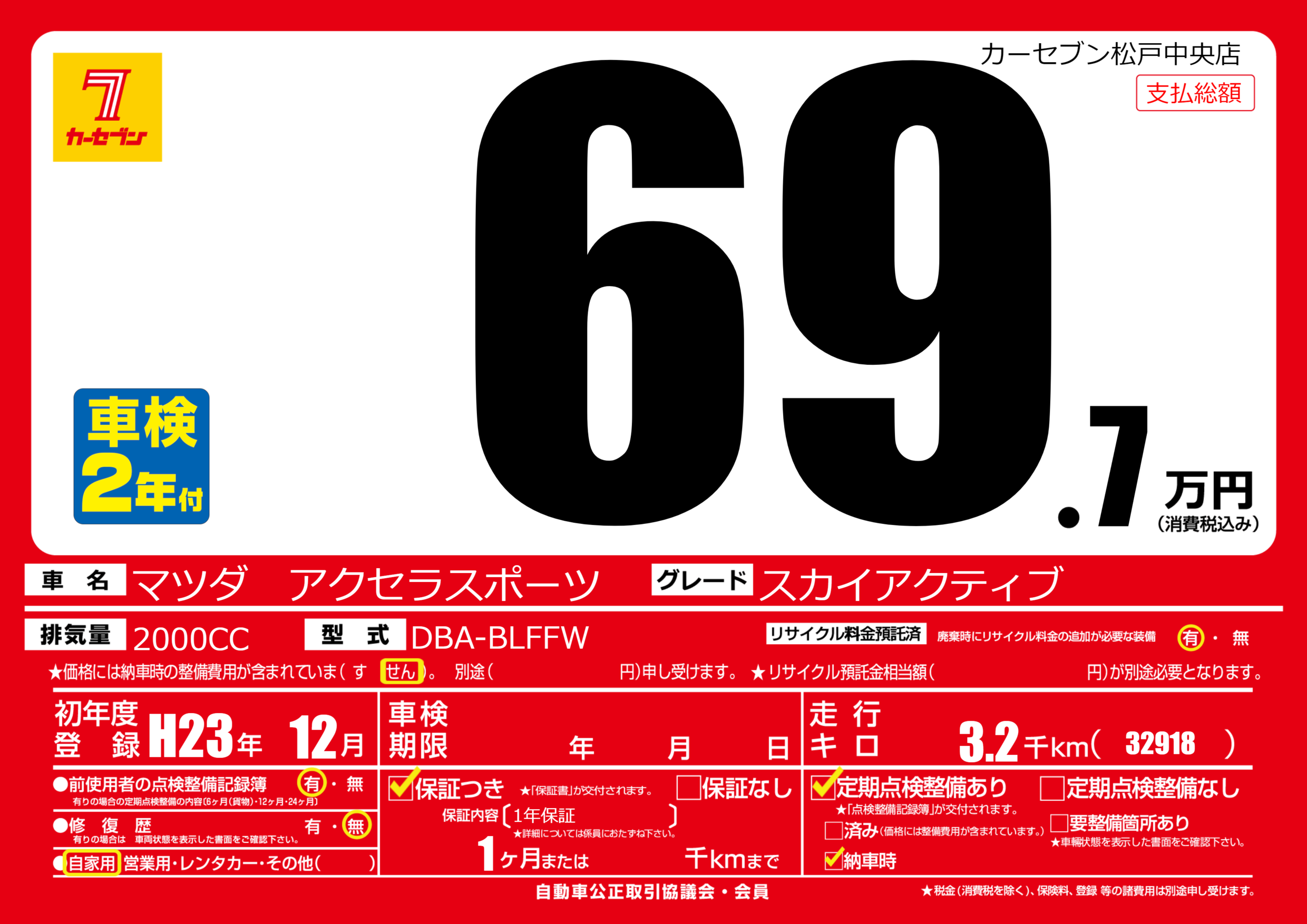 | 走行キロ | 0.3万km | 初年度登録 | H23年12月 |
