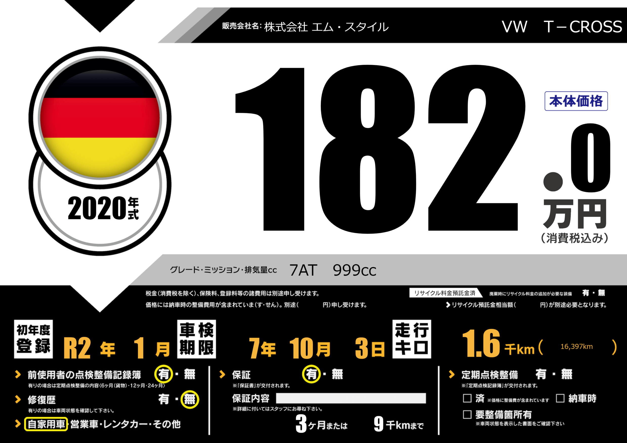 | 車名 | VW T-CROSS | グレード ミッション 排気量 |
