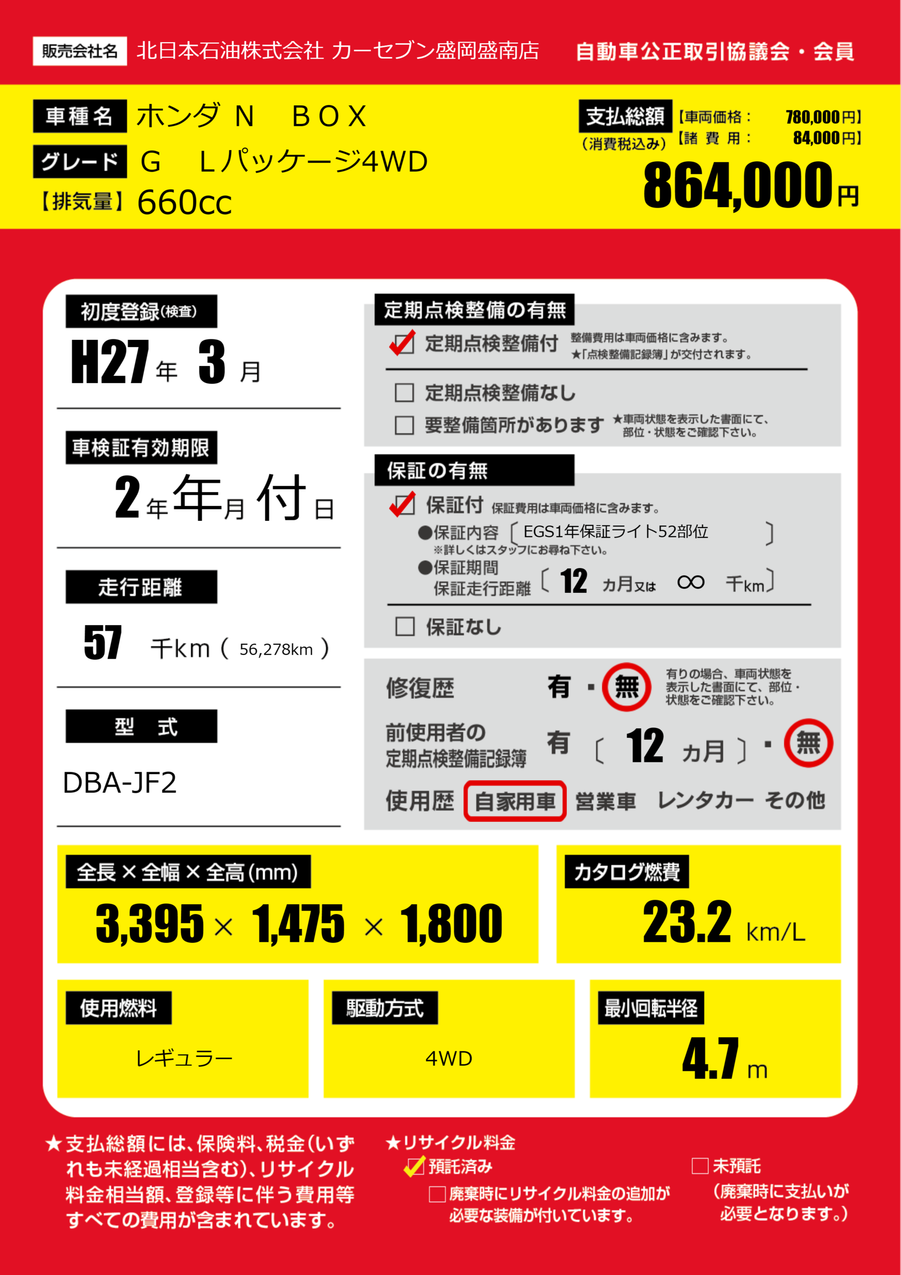 | 車名 | ホンダ N BOX | グレード ミッション 排気量 |