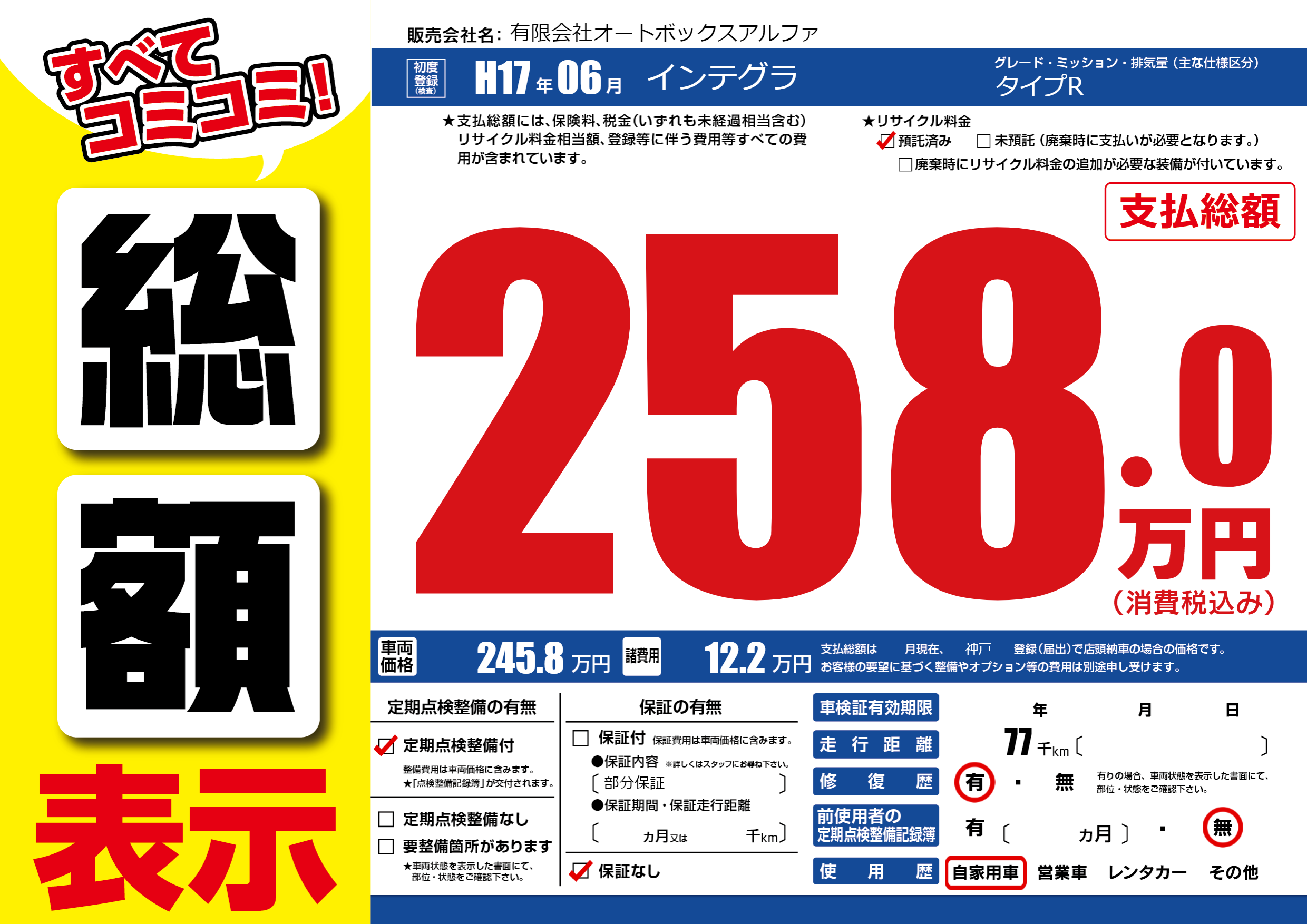 | 走行キロ | 7.7万km | 初年度登録 | H17年06月 |