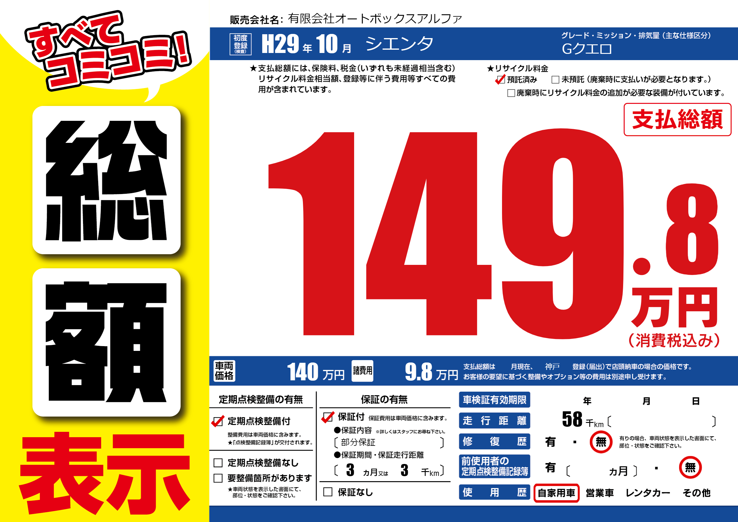 | 車名 | シエンタ | グレード ミッション 排気量 |