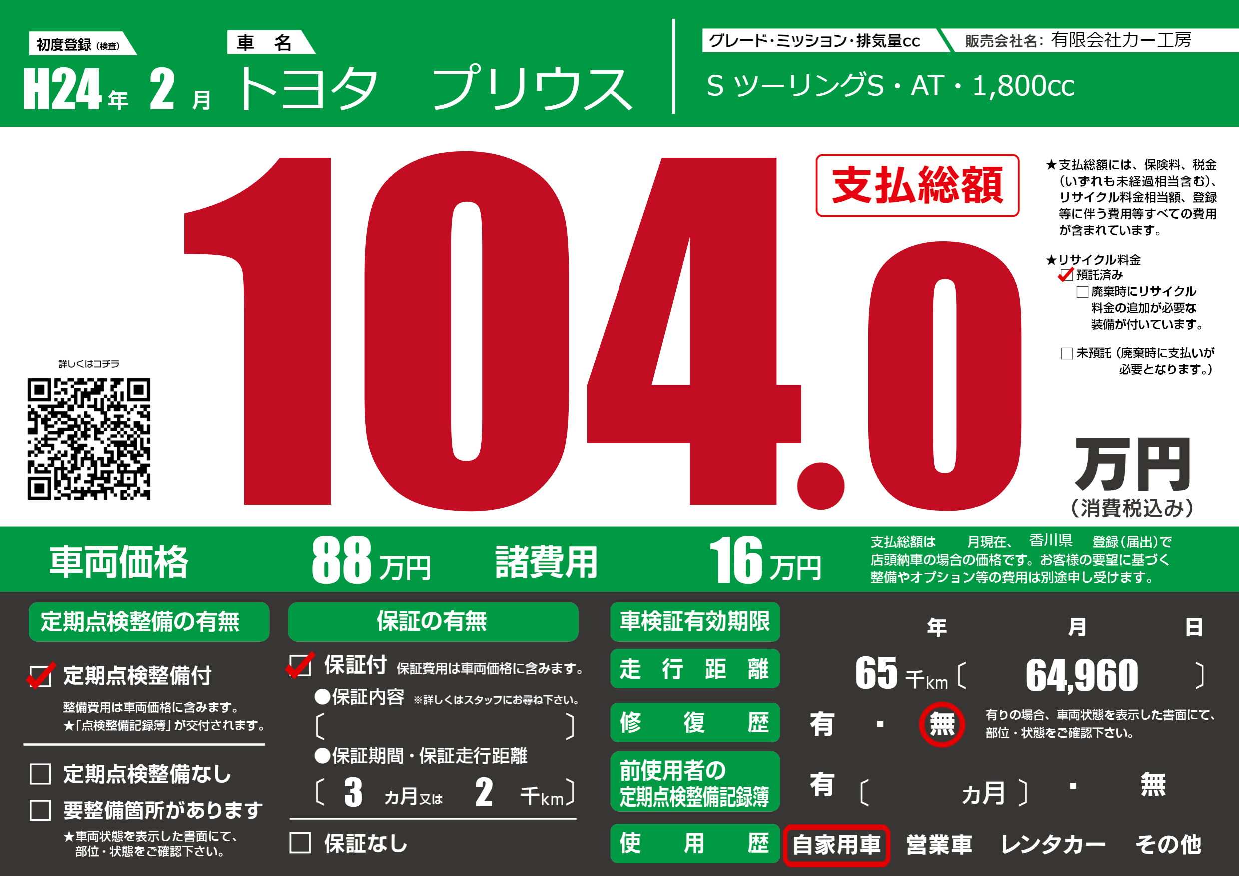 | 車名 | トヨタ プリウス | グレード ミッション 排気量 |