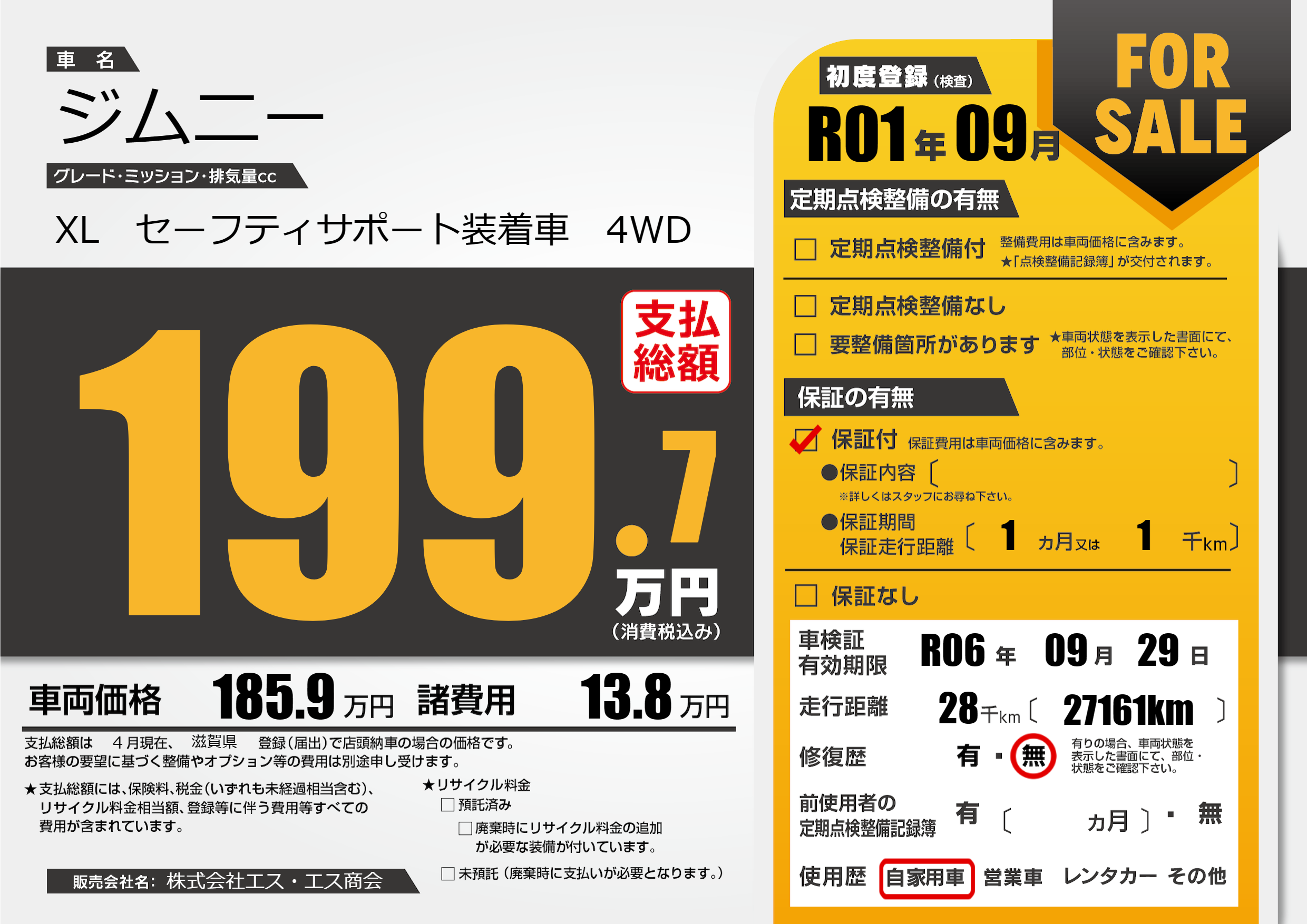 | 車名 | ジムニー | グレード ミッション 排気量 |