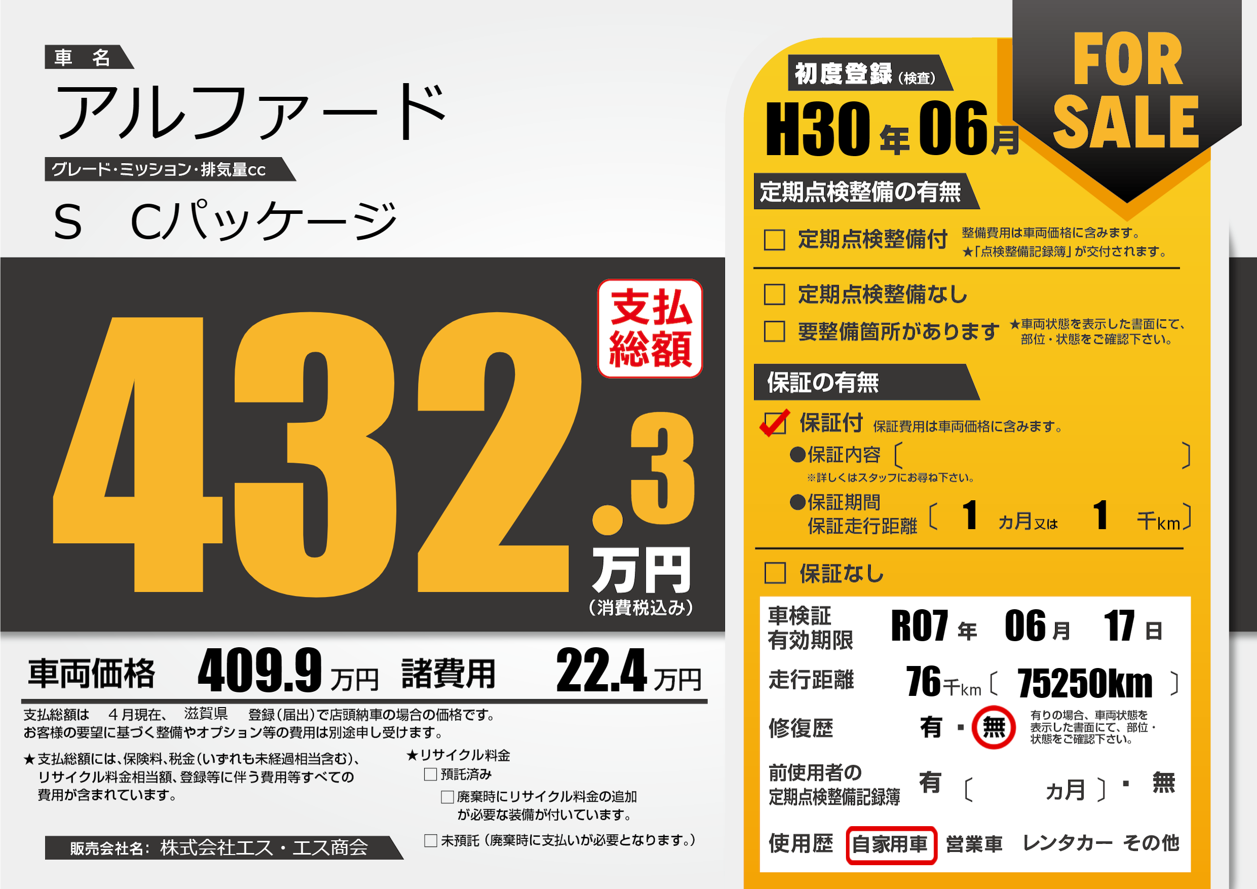| 車名 | アルファード | グレード ミッション 排気量 |