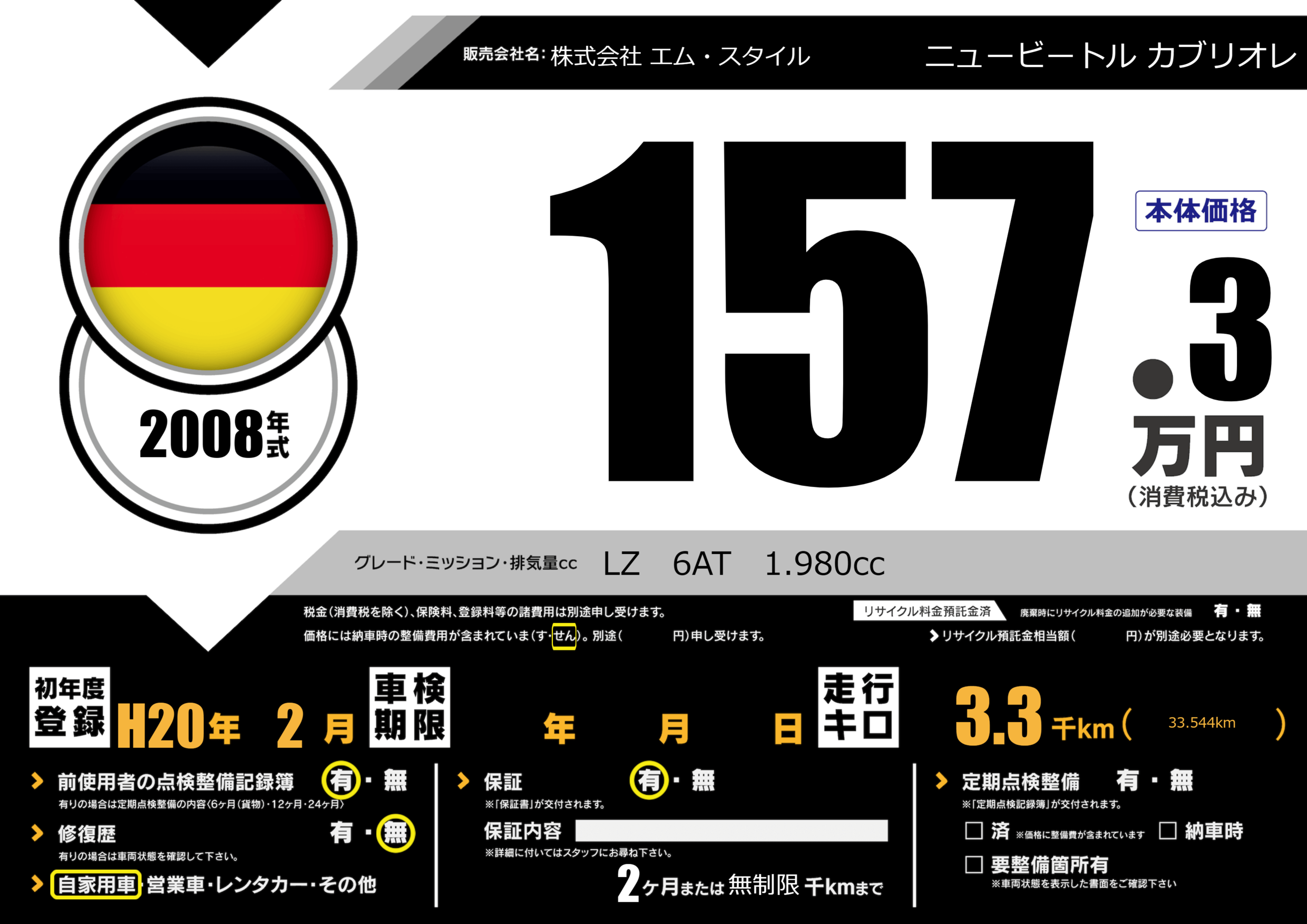 | 車名 | ニュービートル カブリオレ | グレード ミッション 排気量 |