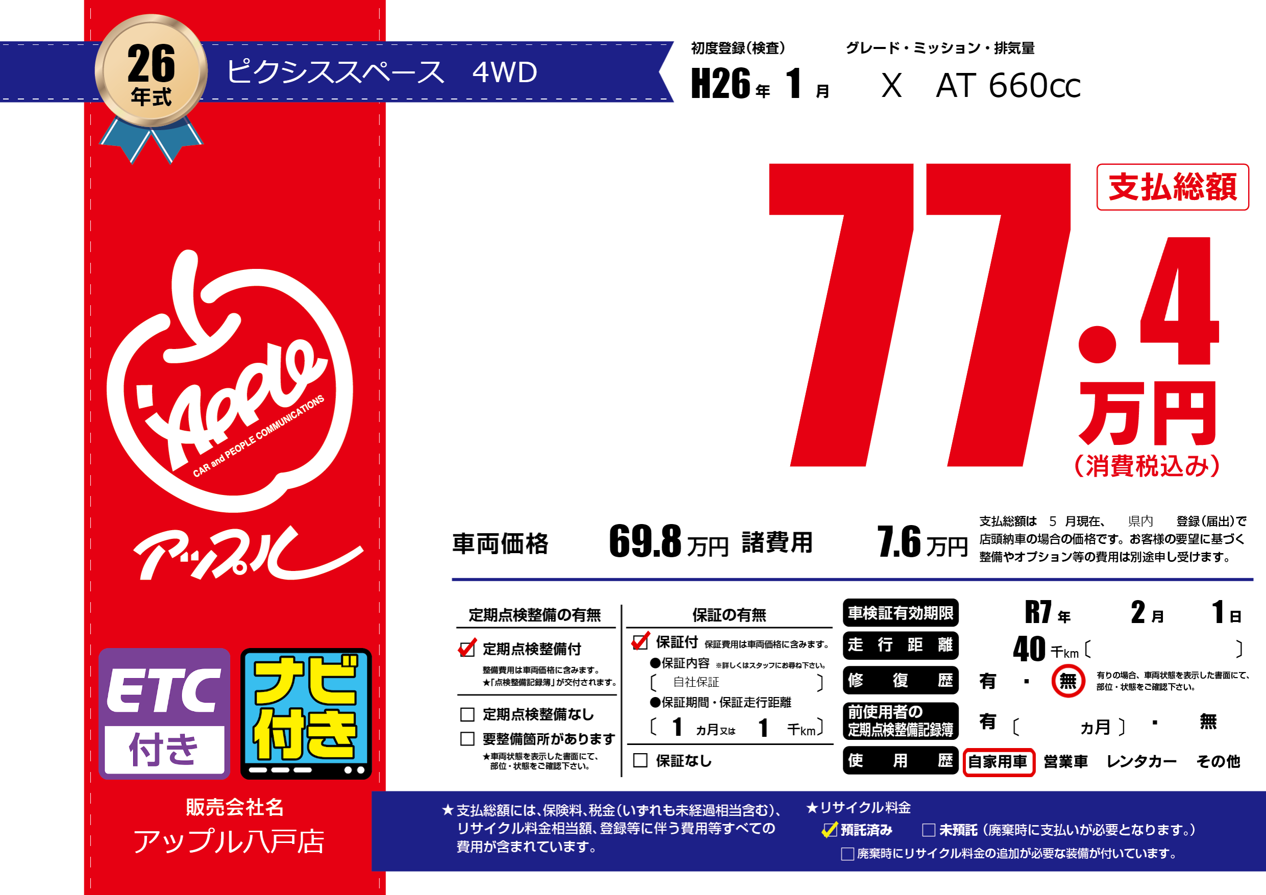 | 走行キロ | 4万km | 初年度登録 | H26年1月 |