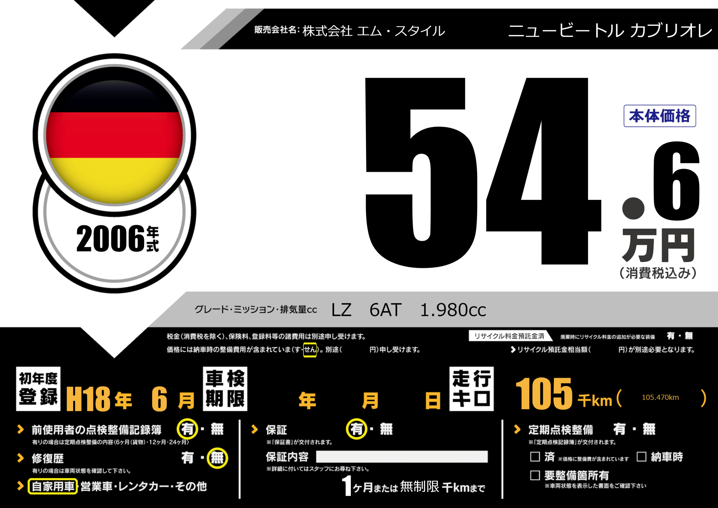 | 車名 | ニュービートル カブリオレ | グレード ミッション 排気量 |