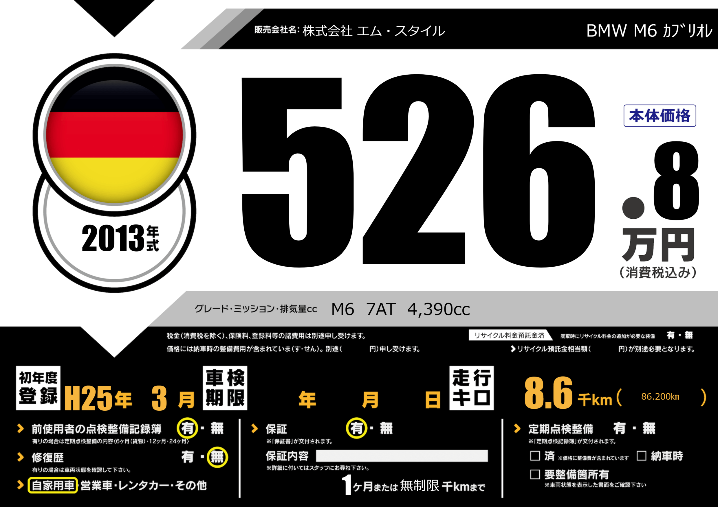 | 車名 | BMW M6 カブリオレ | グレード ミッション 排気量 |