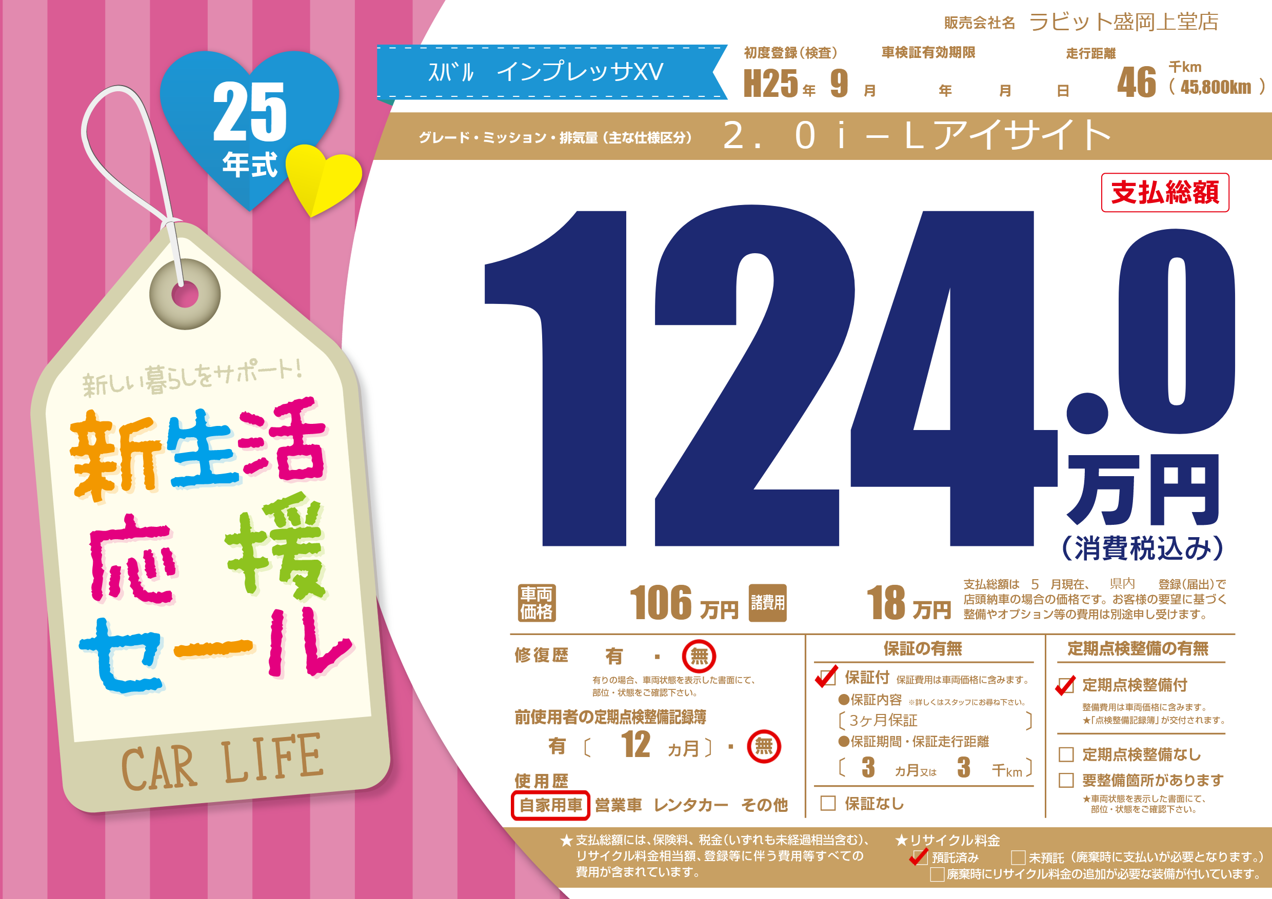 | 車名 | スバル インプレッサXV | グレード ミッション 排気量 |