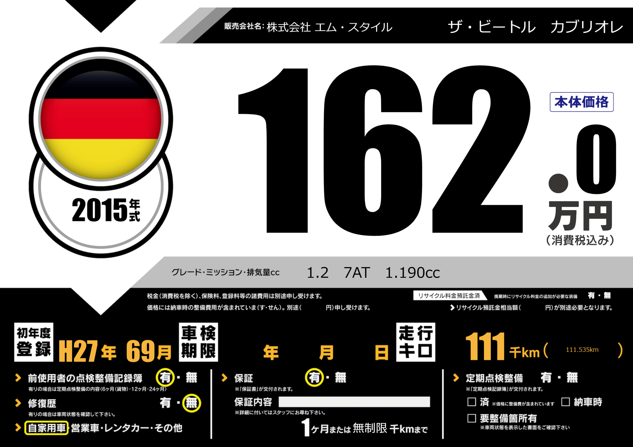 | 車名 | ザ・ビートル カブリオレ | グレード ミッション 排気量 |