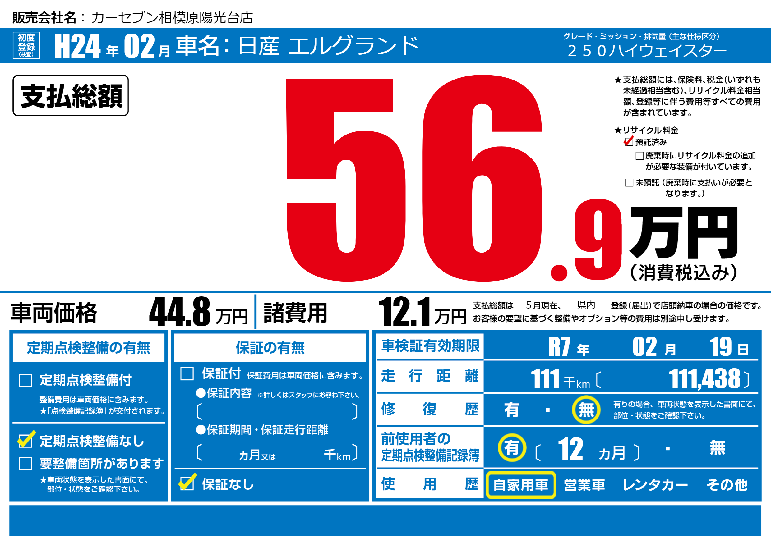| 走行キロ | 11.1万km | 初年度登録 | H24年02月 |