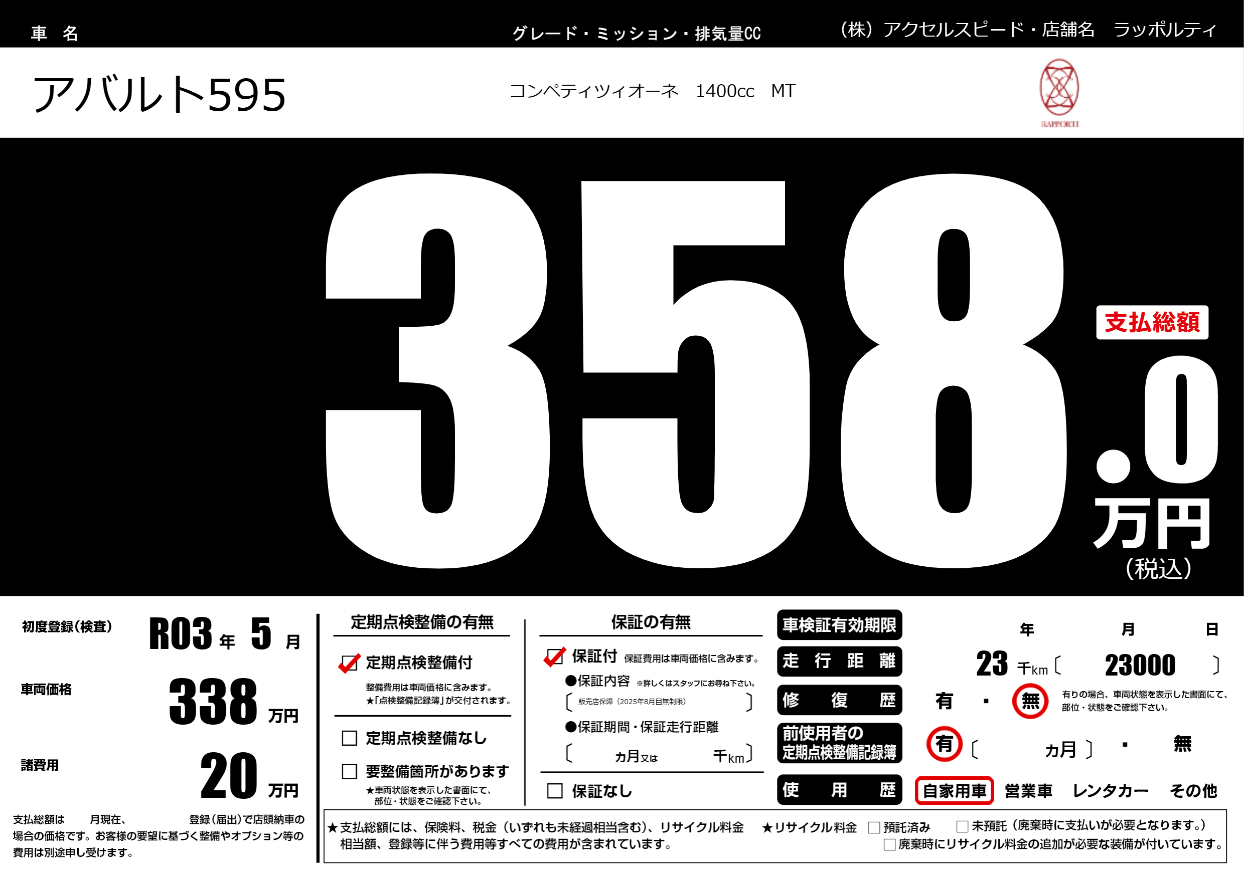 | 車名 | アバルト595 | グレード ミッション 排気量 |