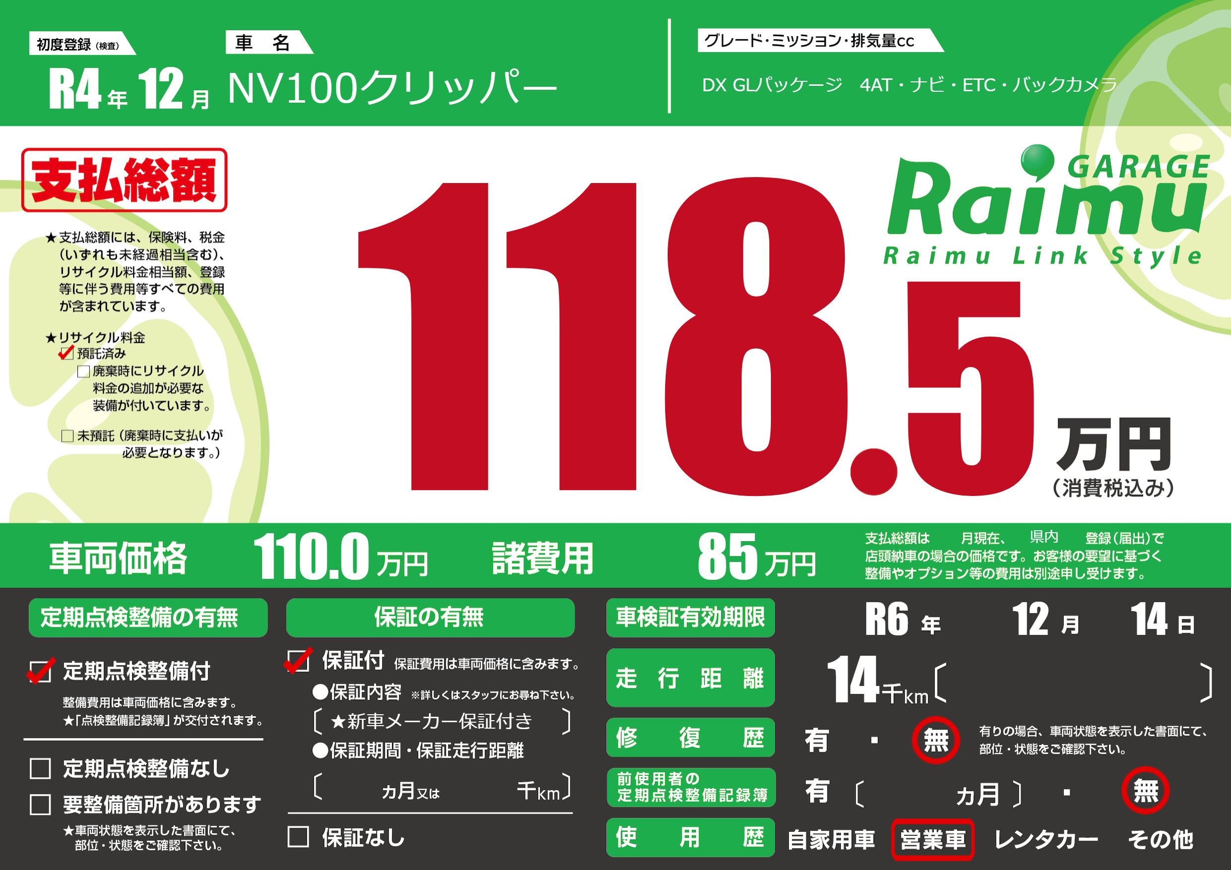 保証付き 保証内容(★新車メーカー保証付き) ヶ月または千km |