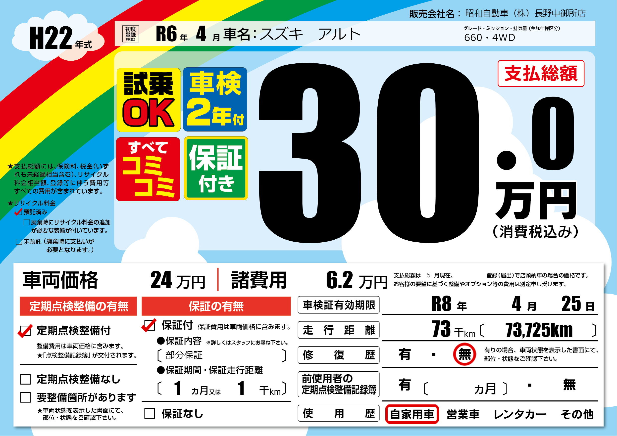 | 車名 | スズキ アルト | グレード ミッション 排気量 |