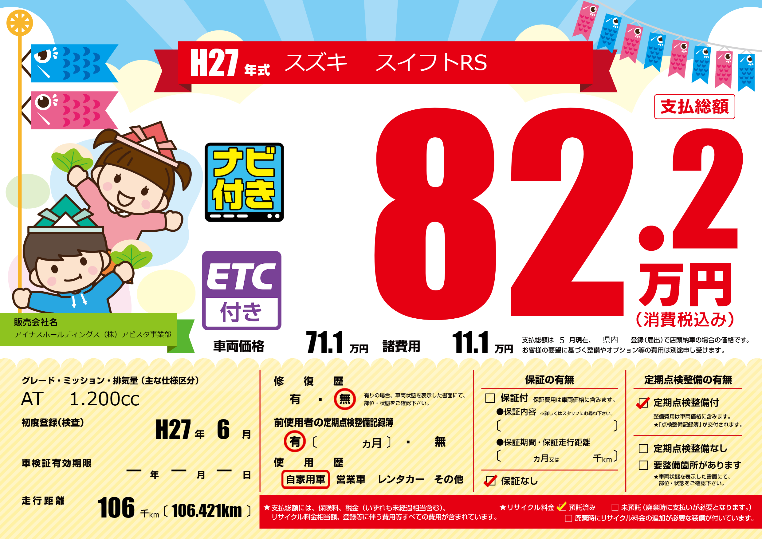 | 走行キロ | 10.6万km | 初年度登録 | H27年6月 |
