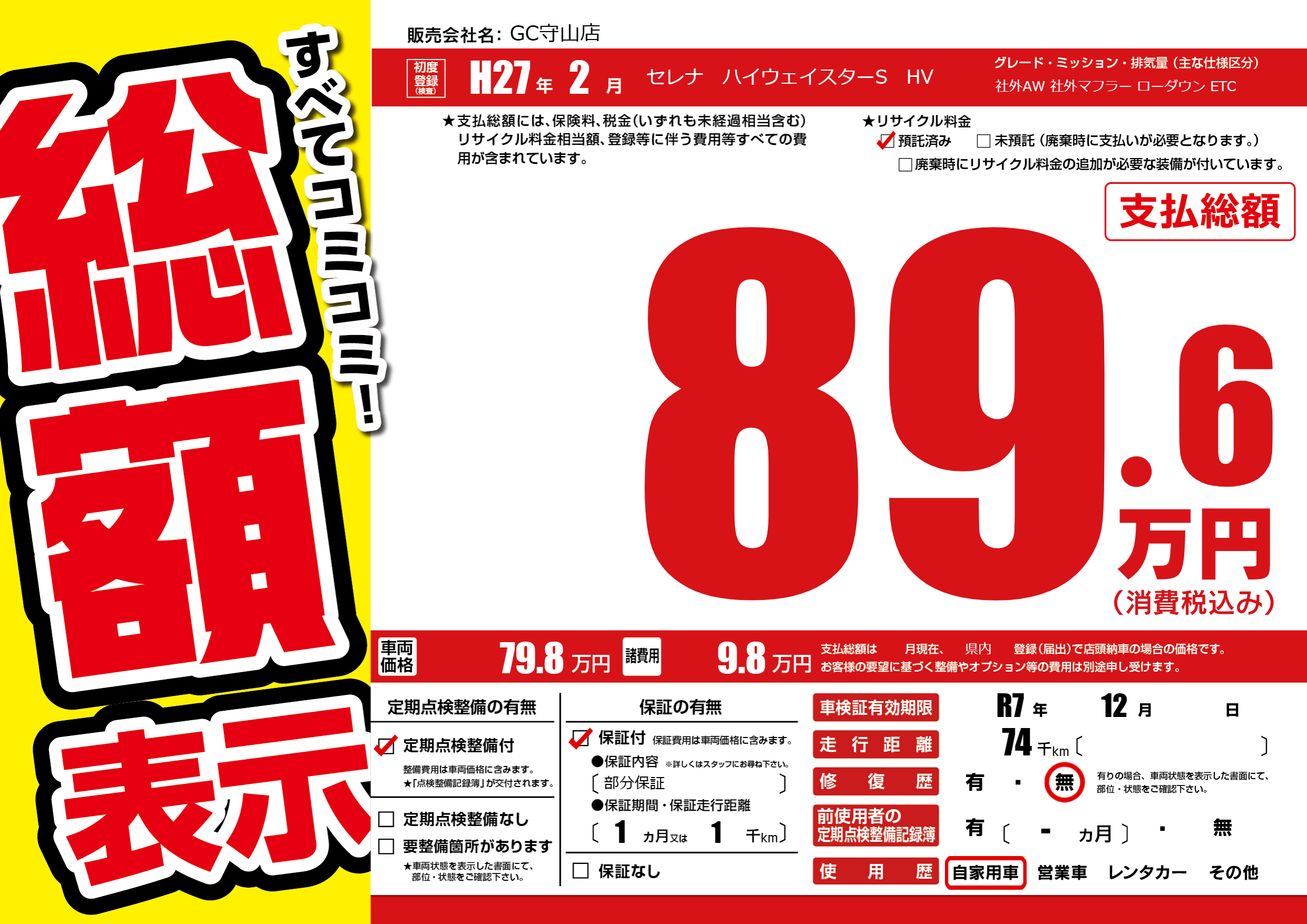 | 車名 | セレナ ハイウェイスターS HV | グレード ミッション 排気量 |