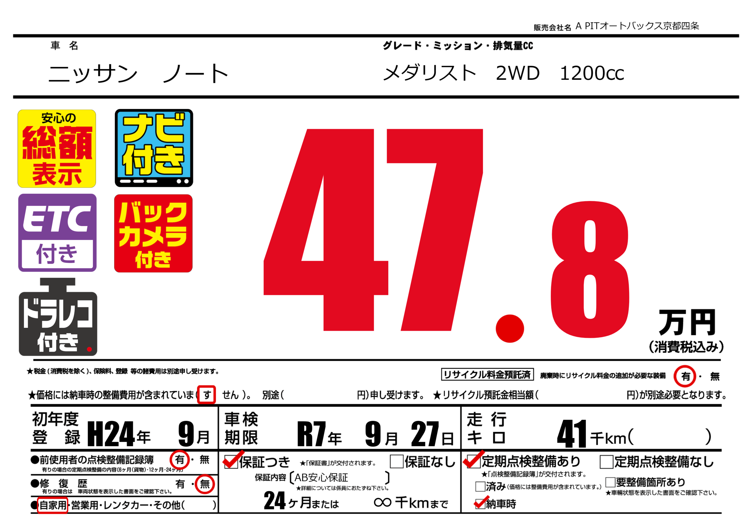 | 走行キロ | 4.1万km | 初年度登録 | H24年9月 |