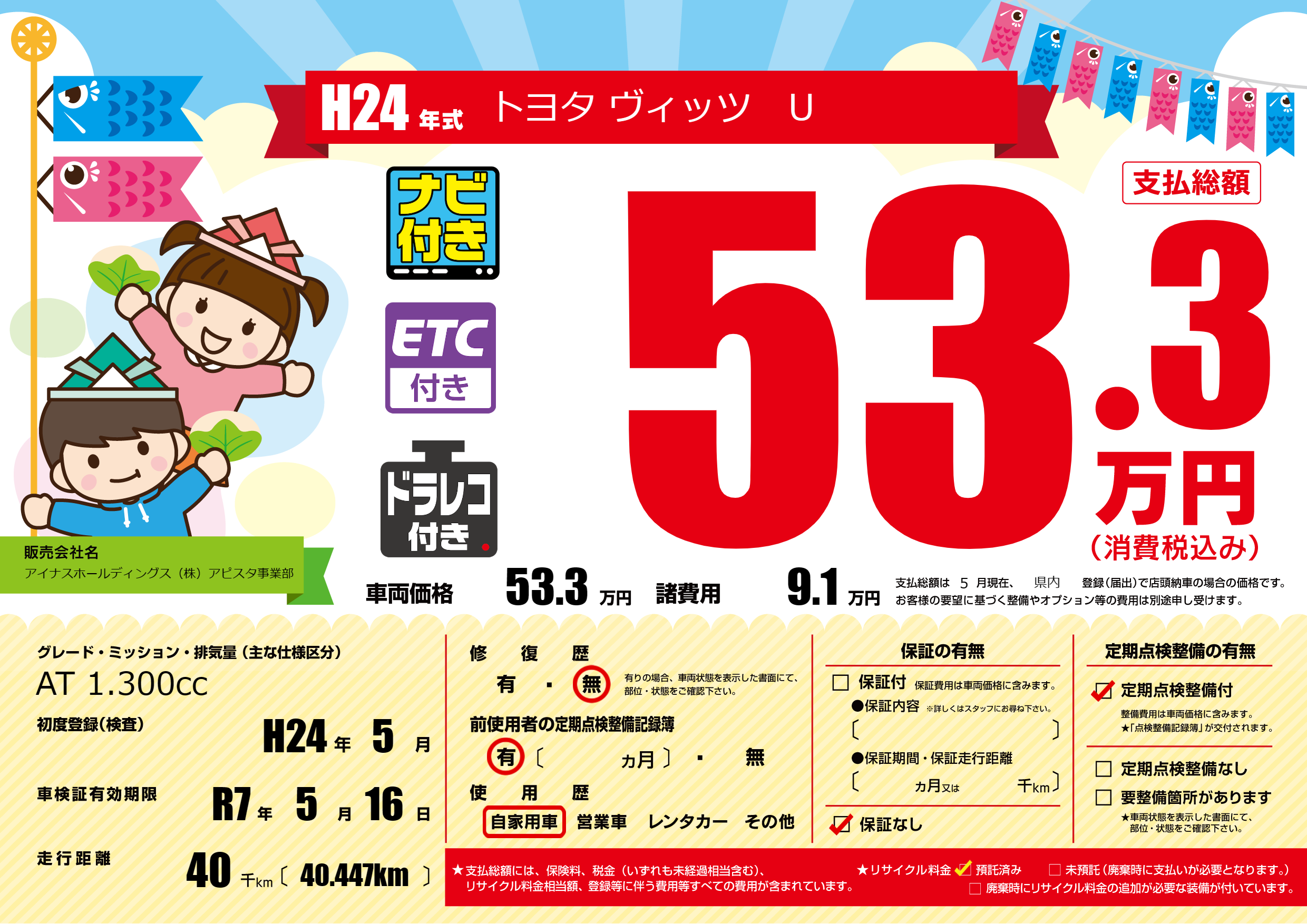 | 車名 | トヨタ ヴィッツ U | グレード ミッション 排気量 |