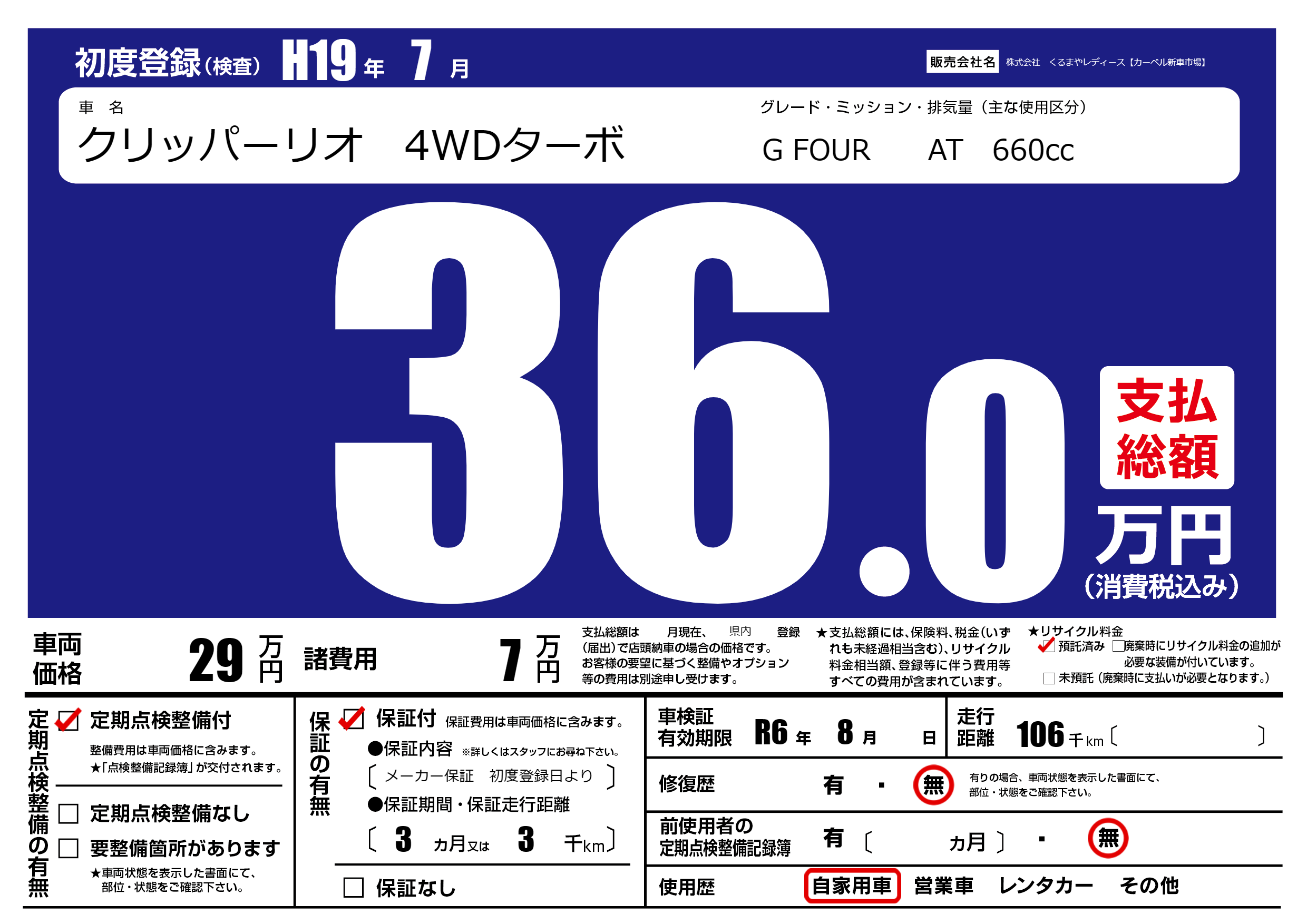 | 車名 | クリッパーリオ 4WDターボ | グレード ミッション 排気量 |