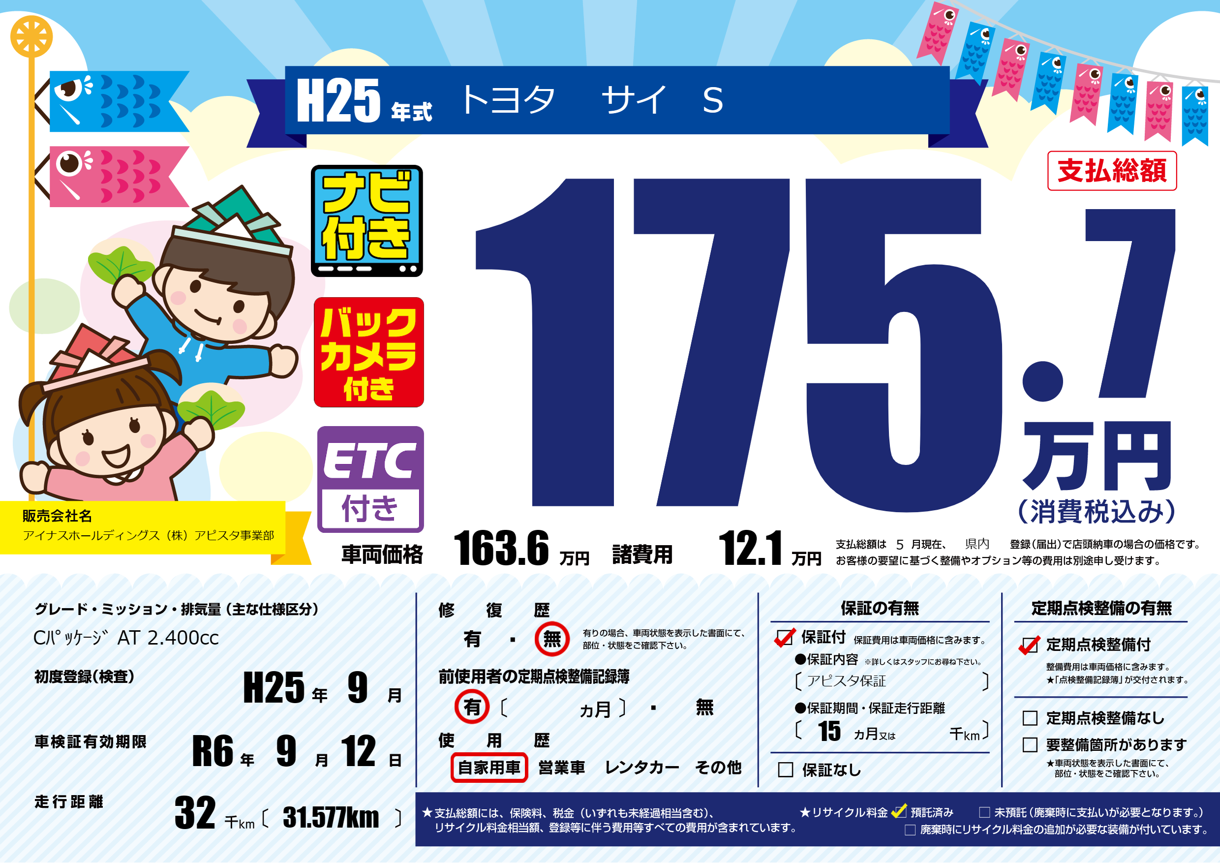 | 車名 | トヨタ サイ S | グレード ミッション 排気量 |