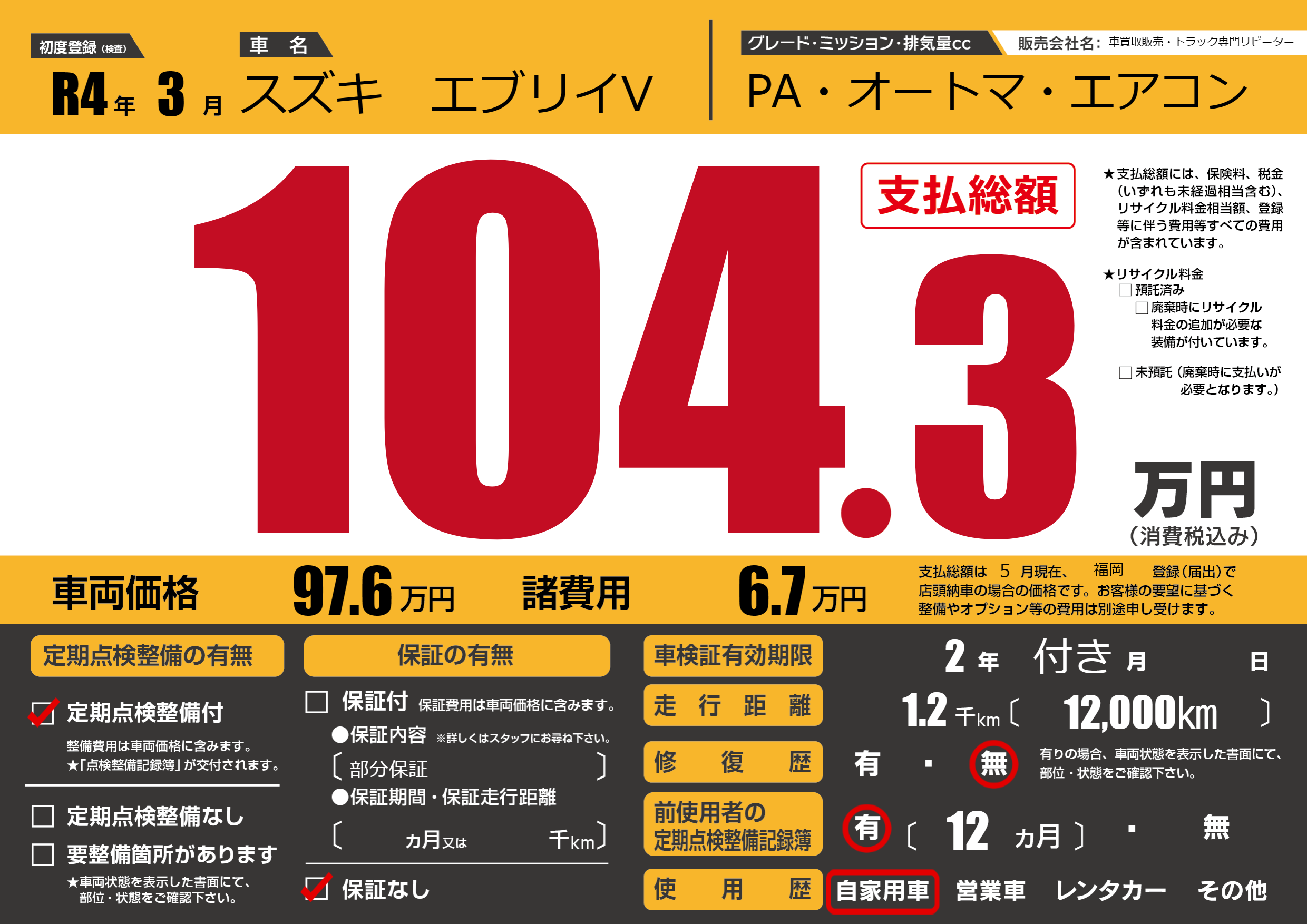 保証なし 保証内容(部分保証) ---ヶ月または()千kmまで |