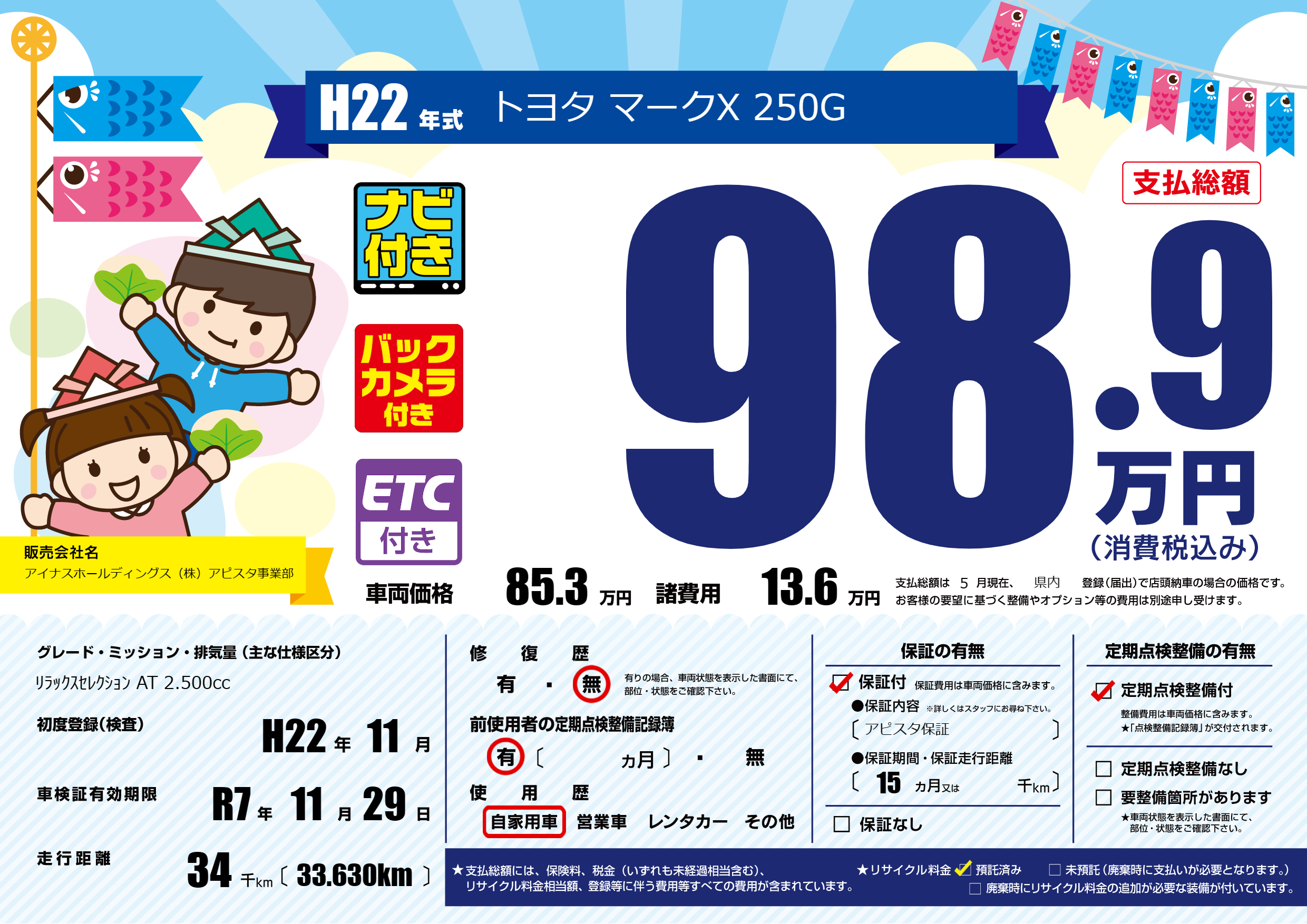 | 車名 | トヨタ マークX 250G | グレード ミッション 排気量 |