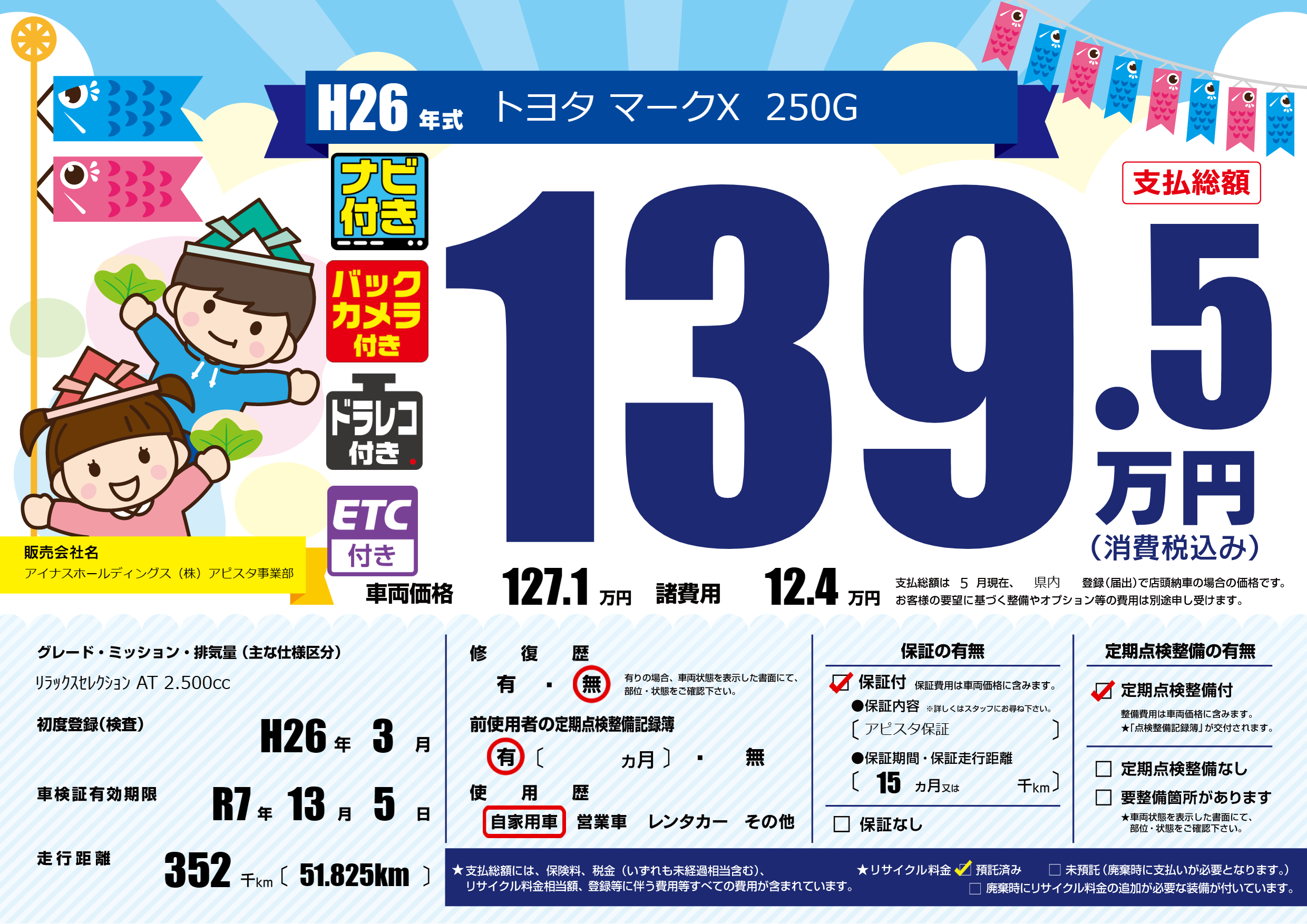 | 車名 | トヨタ マークX 250G | グレード ミッション 排気量 |