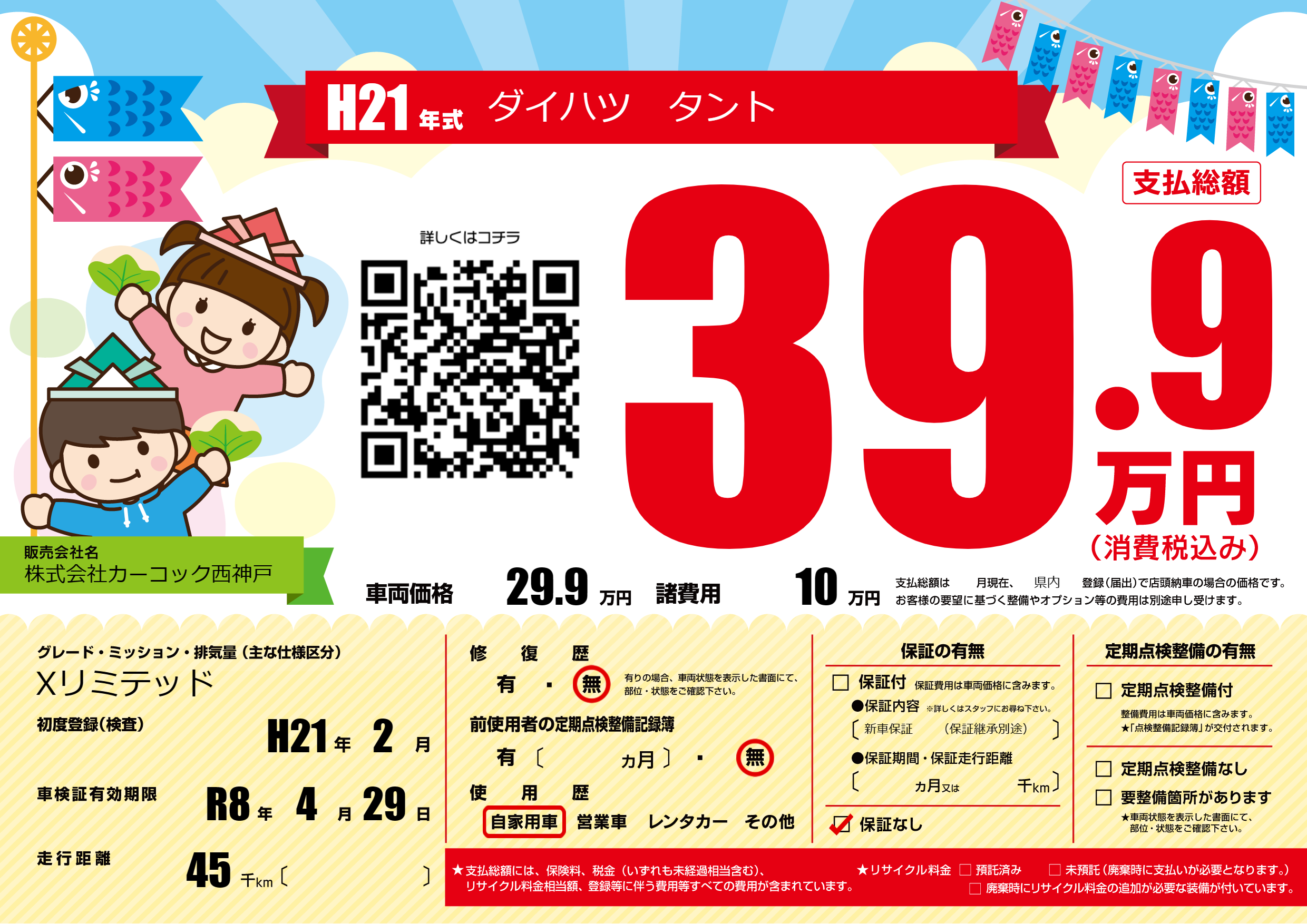 | 走行キロ | 4.5万km | 初年度登録 | H21年2月 |